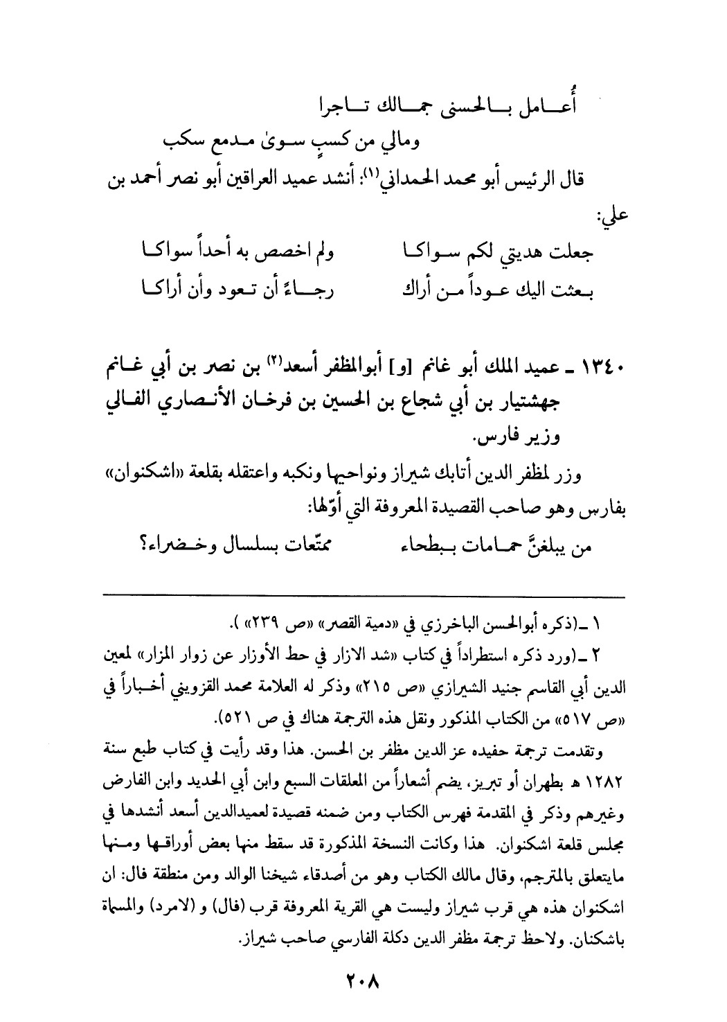 (¬2) (ورد ذكره استطرادا في كتاب «شد الازار في حط الأوزار عن زوار المزار» لمعين الدين أبي القاسم جنيد الشيرازي «ص 215» وذكر له العلامة محمد القزويني أخبارا في «ص 517» من الكتاب المذكور ونقل هذه الترجمة هناك في ص 521). وتقدمت ترجمة حفيده عزّ الدين مظفر بن الحسن. هذا وقد رأيت في كتاب طبع سنة 1282 هـ بطهران أو تبريز، يضم أشعارا من المعلقات السبع وابن أبي الحديد وابن الفارض وغيرهم وذكر في المقدمة فهرس الكتاب ومن ضمنه قصيدة لعميد الدين أسعد أنشدها في مجلس قلعة اشكنوان. هذا وكانت النسخة المذكورة قد سقط منها بعض أوراقها ومنها ما يتعلق بالمترجم، وقال مالك الكتاب وهو من أصدقاء شيخنا الوالد ومن منطقة قال: ان اشكنوان هذه هي قرب شيراز وليست هي القرية المعروفة قرب (فال) و (لامرد) والمسماة باشكنان. ولا حظ ترجمة مظفر الدين دكلة الفارسي صاحب شيراز.