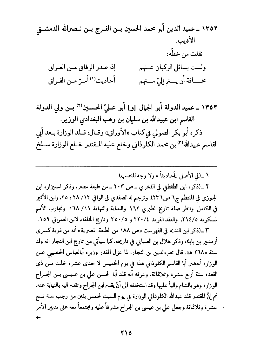 (¬2) (ذكره ابن الطقطقي في الفخري - ص 203 - من طبعة مصر، وذكر استيزاره ابن الجوزي في المنتظم ج 6 ص 236)، وترجم له الصفدي في الوافي 28/ 13: 25، وابن الأثير في الكامل، وانظر صلة تاريخ الطبري 162 والبداية والنهاية 168/ 11 وتجارب الامم لمسكويه 214/ 5، والعقد الفريد 220/ 4 و 350/ 5 وتاريخ الخلفاء لابن العمراني 159.