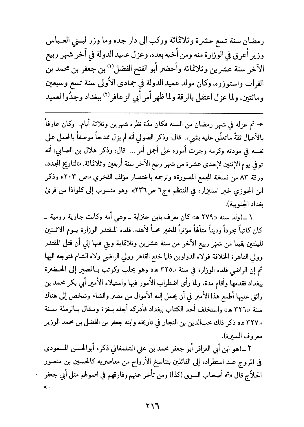 رمضان سنة تسع عشرة وثلاثمائة وركب إلى دار جده وما وزر لبني العباس وزير أعرق في الوزارة منه ومن أخيه بعده، وعزل عميد الدولة في آخر شهر ربيع الآخر سنة عشرين وثلاثمائة وأحضر أبو الفتح الفضل (¬1) بن جعفر بن محمد بن الفرات واستوزره، وكان مولد عميد الدولة في جمادى الاولى سنة تسع وسبعين ومائتين، ولما عزل اعتقل بالرقة ولما ظهر أمر أبي الزعافر (¬2) ببغداد وجدوا لعميد