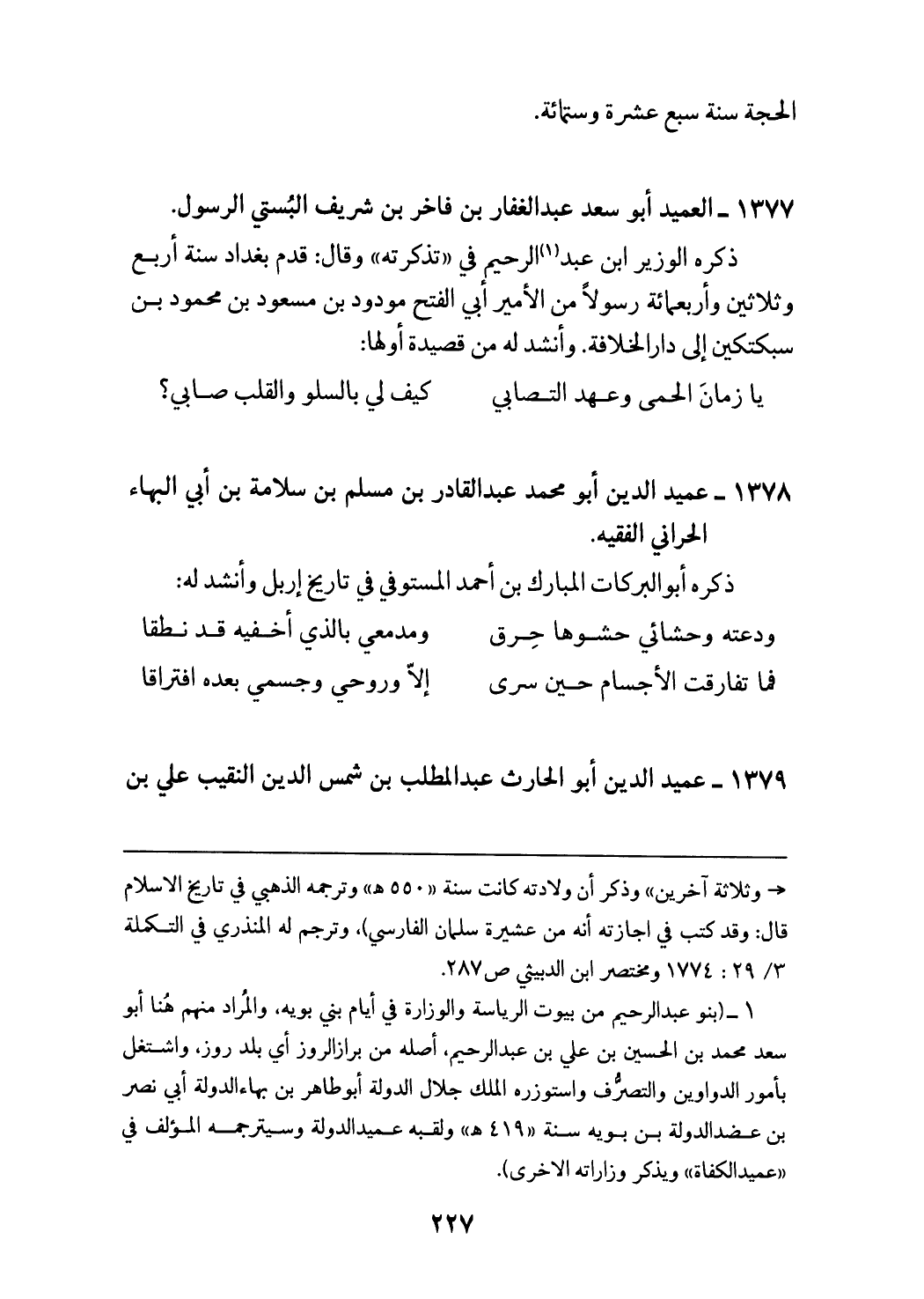 (¬1) (بنو عبد الرحيم من بيوت الرياسة والوزارة في أيام بني بويه، والمراد منهم هنا أبو سعد محمد بن الحسين بن علي بن عبد الرحيم، أصله من براز الروز أي بلد روز، واشتغل بأمور الدواوين والتصرّف واستوزره الملك جلال الدولة أبو طاهر بن بهاء الدولة أبي نصر بن عضد الدولة بن بويه سنة «419 هـ» ولقبه عميد الدولة وسيترجمه المؤلف في «عميد الكفاة» ويذكر وزاراته الاخرى).