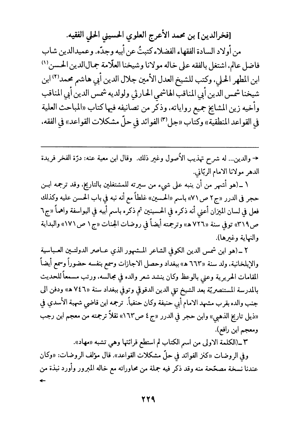 من أولاد السادة الفقهاء الفضلاء كتبت عن أبيه وجدّه. وعميد الدين شاب فاضل عالم، اشتغل بالفقه على خاله مولانا وشيخنا العلاّمة جمال الدين الحسن (¬1) ابن المطهر الحلي، وكتب للشيخ العدل الأمين جلال الدين أبي هاشم محمد (¬2) ابن شيخنا شمس الدين أبي المناقب الهاشمي الحارثي ولولديه شمس الدين أبي المناقب وأخيه زين المشايخ جميع رواياته، وذكر من تصانيفه فيها كتاب «المباحث العلية في القواعد المنطقية» وكتاب «جل (¬3) الفوائد في حلّ مشكلات القواعد» في الفقه،