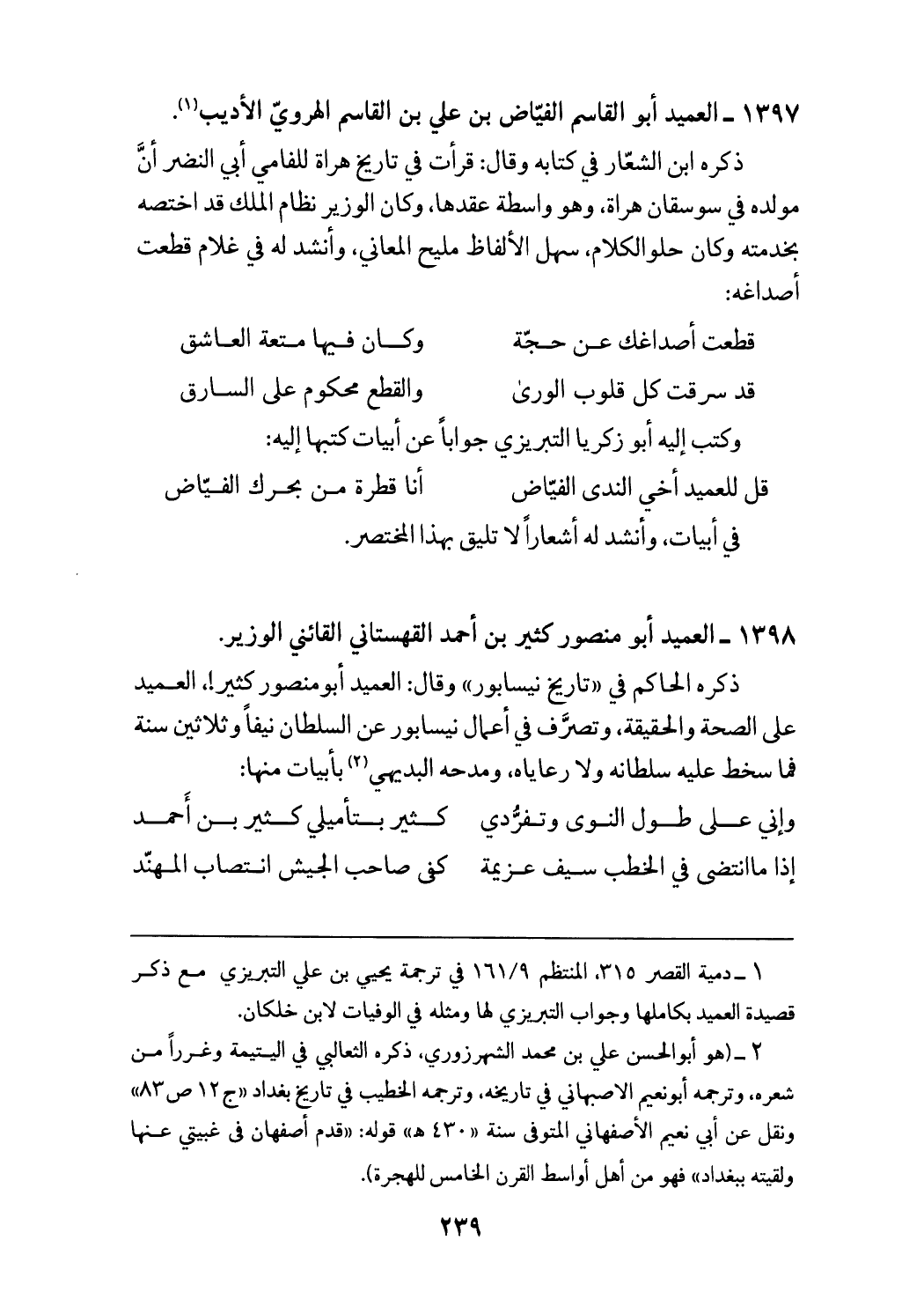 (¬2) (هو أبو الحسن علي بن محمد الشهرزوري، ذكره الثعالبي في اليتيمة وغررا من شعره، وترجمه أبو نعيم الاصبهاني في تاريخه، وترجمه الخطيب في تاريخ بغداد «ج 12 ص 83» ونقل عن أبي نعيم الأصفهاني المتوفى سنة «430 هـ» قوله: «قدم أصفهان في غيبتي عنها ولقيته ببغداد» فهو من أهل أواسط القرن الخامس للهجرة).