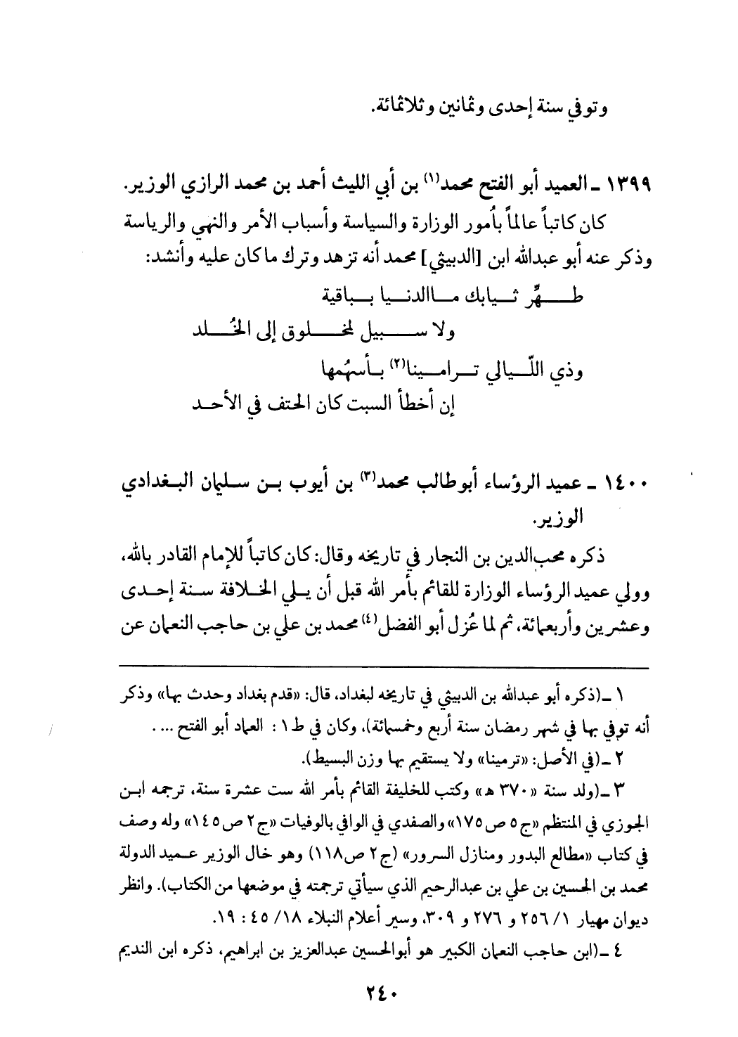 (¬3) (ولد سنة «370 هـ» وكتب للخليفة القائم بأمر الله ست عشرة سنة، ترجمه ابن الجوزي في المنتظم «ج 5 ص 175» والصفدي في الوافي بالوفيات «ج 2 ص 145» وله وصف في كتاب «مطالع البدور ومنازل السرور» (ج 2 ص 118) وهو خال الوزير عميد الدولة محمد بن الحسين بن علي بن عبد الرحيم الذي سيأتي ترجمته في موضعها من الكتاب). وانظر ديوان مهيار 256/ 1 و 276 و 309، وسير أعلام النبلاء 45/ 18: 19.
