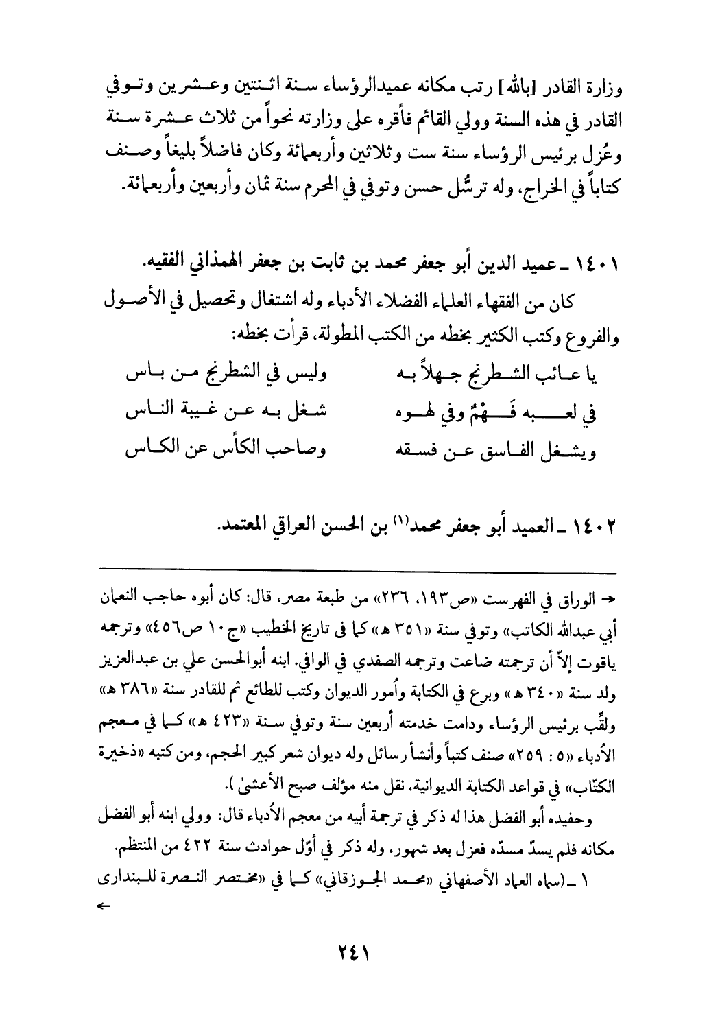 1402 - العميد أبو جعفر محمد (¬1) بن الحسن العراقي المعتمد.