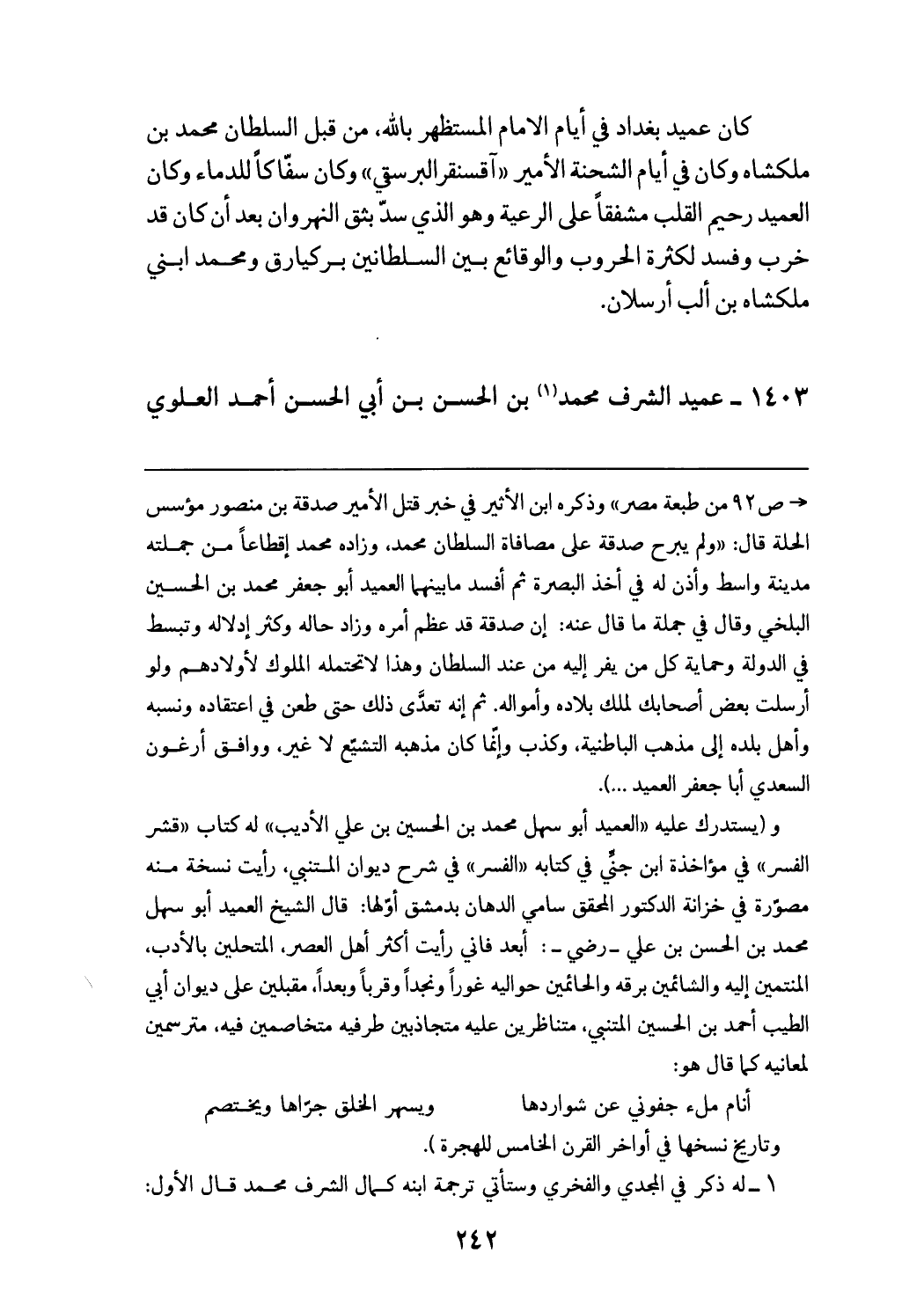 ص 92 من طبعة مصر» وذكره ابن الأثير في خبر قتل الأمير صدقة بن منصور مؤسس الحلة قال: «ولم يبرح صدقة على مصافاة السلطان محمد، وزاده محمد إقطاعا من جملته مدينة واسط وأذن له في أخذ البصرة ثم أفسد ما بينهما العميد أبو جعفر محمد بن الحسين البلخي وقال في جملة ما قال عنه: إن صدقة قد عظم أمره وزاد حاله وكثر إدلاله وتبسط في الدولة وحماية كل من يفر إليه من عند السلطان وهذا لا تحتمله الملوك لأولادهم ولو أرسلت بعض أصحابك لملك بلاده وأمواله. ثم إنه تعدّى ذلك حتى طعن في اعتقاده ونسبه وأهل بلده إلى مذهب الباطنية، وكذب وإنّما كان مذهبه التشيّع لا غير، ووافق أرغون السعدي أبا جعفر العميد ...). و (يستدرك عليه «العميد أبو سهل محمد بن الحسين بن علي الأديب» له كتاب «قشر الفسر» في مؤاخذة ابن جنّي في كتابه «الفسر» في شرح ديوان المتنبي، رأيت نسخة منه مصوّرة في خزانة الدكتور المحقق سامي الدهان بدمشق أوّلها: قال الشيخ العميد أبو سهل محمد بن الحسن بن علي - رضي -: أبعد فاني رأيت أكثر أهل العصر، المتحلين بالأدب، المنتمين إليه والشائمين برقه والحائمين حواليه غورا ونجدا وقربا وبعدا، مقبلين على ديوان أبي الطيب أحمد بن الحسين المتنبي، متناظرين عليه متجاذبين طرفيه متخاصمين فيه، مترسمين لمعانيه كما قال هو:
