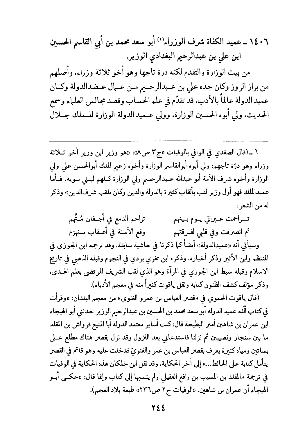 (¬1) (قال الصفدي في الوافي بالوفيات «ج 3 ص 8»: «هو وزير ابن وزير أخو ثلاثة وزراء وهو درّة تاجهم: ولي أبوه أبو القاسم الوزارة وأخوه زعيم الملك أبو الحسن علي ولي الوزارة وأخوه شرف الأمة أبو عبد الله عبد الرحيم ولي الوزارة كلهم لبني بويه. فأما عميد الملك فهو أول وزير لقب بألقاب كثيرة بالدولة والدين وكان يلقب شرف الدين» وذكر له من الشعر: