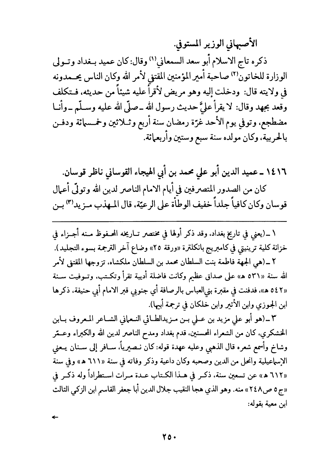 (¬1) (يعني في تاريخ بغداد، وقد ذكر أولها في مختصر تاريخه المحفوظ منه أجزاء في خزانة كلية ترينيتي في كامبريج بانكلترة «ورقة 25» وضاع آخر الترجمة بسوء التجليد).