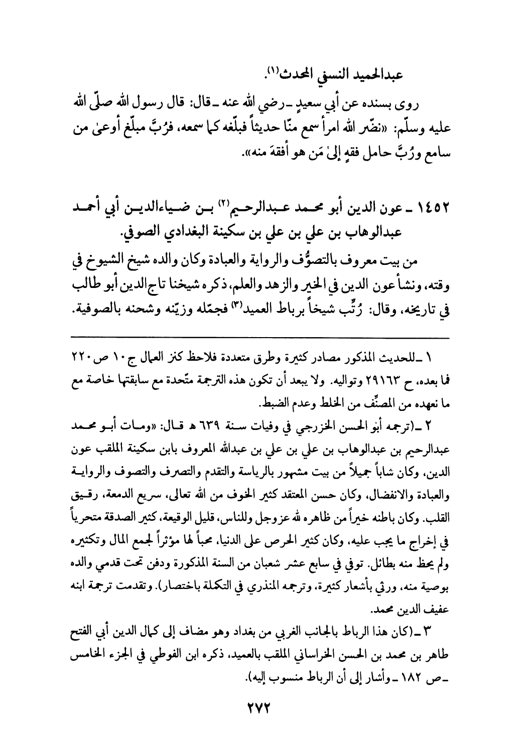 روى بسنده عن أبي سعيد - رضي الله عنه - قال: قال رسول الله صلّى الله عليه وسلّم: «نضّر الله امرأ سمع منّا حديثا فبلّغه كما سمعه، فربّ مبلّغ أوعى من سامع وربّ حامل فقه إلى من هو أفقه منه».