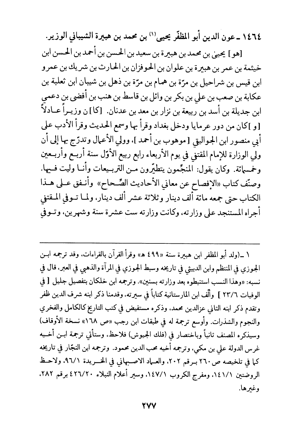 [هو] يحيى بن محمد بن هبيرة بن سعيد بن الحسن بن أحمد بن الحسن ابن خيثمة بن عمر بن هبيرة بن علوان بن الحوفزان بن الحارث بن شريك بن عمرو ابن قيس بن شراحيل بن مرّة بن همام بن مرّة بن ذهل بن شيبان ابن ثعلبة بن عكابة بن صعب بن علي بن بكر بن وائل بن قاسط بن هنب بن أفضى بن دعمي ابن جديلة بن أسد بن ربيعة بن نزار بن معد بن عدنان. [كا] ن وزيرا عادلا [و] كان من دور عرمايا ودخل بغداد وقرأ بها وسمع الحديث وقرأ الأدب على أبي منصور ابن الجواليقي [موهوب بن أحمد]، وولي الأعمال وتدرّج بها إلى أن ولي الوزارة للإمام المقتفي في يوم الأربعاء رابع ربيع الأوّل سنة أربع وأربعين وخمسمائة. وكان يقول: المنجّمون يتطيّرون من التربيعات وأنا وليت فيها.