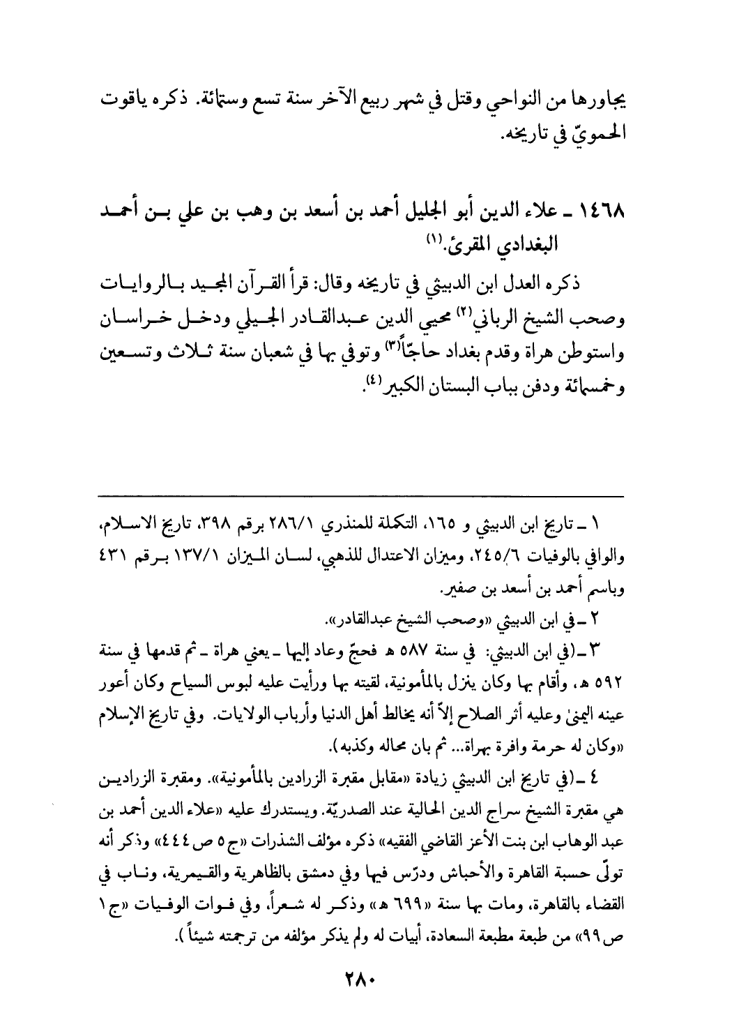 (¬4) (في تاريخ ابن الدبيثي زيادة «مقابل مقبرة الزرادين بالمأمونية».ومقبرة الزرادين هي مقبرة الشيخ سراج الدين الحالية عند الصدريّة. ويستدرك عليه «علاء الدين أحمد بن عبد الوهاب ابن بنت الأعز القاضي الفقيه» ذكره مؤلف الشذرات «ج 5 ص 444» وذكر أنه تولّى حسبة القاهرة والأحباش ودرّس فيها وفي دمشق بالظاهرية والقيمرية، وناب في القضاء بالقاهرة، ومات بها سنة «699 هـ» وذكر له شعرا، وفي فوات الوفيات «ج 1 ص 99» من طبعة مطبعة السعادة، أبيات له ولم يذكر مؤلفه من ترجمته شيئا).