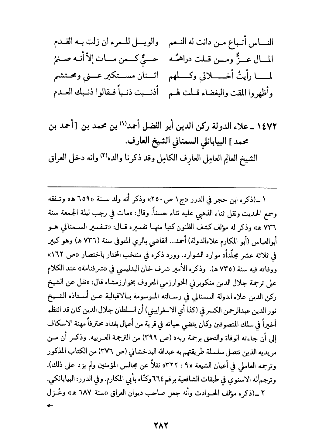 (¬1) (ذكره ابن حجر في الدرر «ج 1 ص 250» وذكر أنه ولد سنة «659 هـ» وتفقه وسمع الحديث ونقل ثناء الذهبي عليه ثناء حسنا. وقال: «مات في رجب ليلة الجمعة سنة 736 هـ» وذكر له مؤلف كشف الظنون كتبا منها تفسيره قال: «تفسير السمناني هو أبو العباس (أبو المكارم علاء الدولة) أحمد ... القاضي بالري المتوفى سنة (736 هـ) وهو كبير في ثلاثة عشر مجلّدا» موارد الشوارد. وورد ذكره في منتخب المختار باختصار «ص 162» ووفاته فيه سنة (735 هـ). وذكره الأمير شرف خان البدليسي في «شرفنامة» عند الكلام على ترجمة جلال الدين منكوبرني الخوارزمي المعروف بخوارزم شاه قال: «نقل عن الشيخ ركن الدين علاء الدولة السمناني في رسالته الموسومة بالاقبالية عن أستاذه الشيخ نور الدين عبد الرحمن الكسرفي (كذا أي الاسفراييني) أن السلطان جلال الدين كان قد انتظم أخيرا في سلك المتصوفين وكان يقضي حياته في قرية من أعمال بغداد محترفا مهنة الاسكاف إلى أن جاءته الوفاة والتحق برحمة ربه» (ص 399) من الترجمة العربية. وذكر أن من مريديه الذين تتصل سلسلة طريقتهم به عبد الله البدخشاني (ص 376) من الكتاب المذكور وترجمه العاملي في أعيان الشيعة «9: 322» نقلا عن مجالس المؤمنين ولم يزد على ذلك). وترجم له الاسنوي في طبقات الشافعية برقم 664 وكنّاه بأبي المكارم. وفي الدرر: البيابانكي.