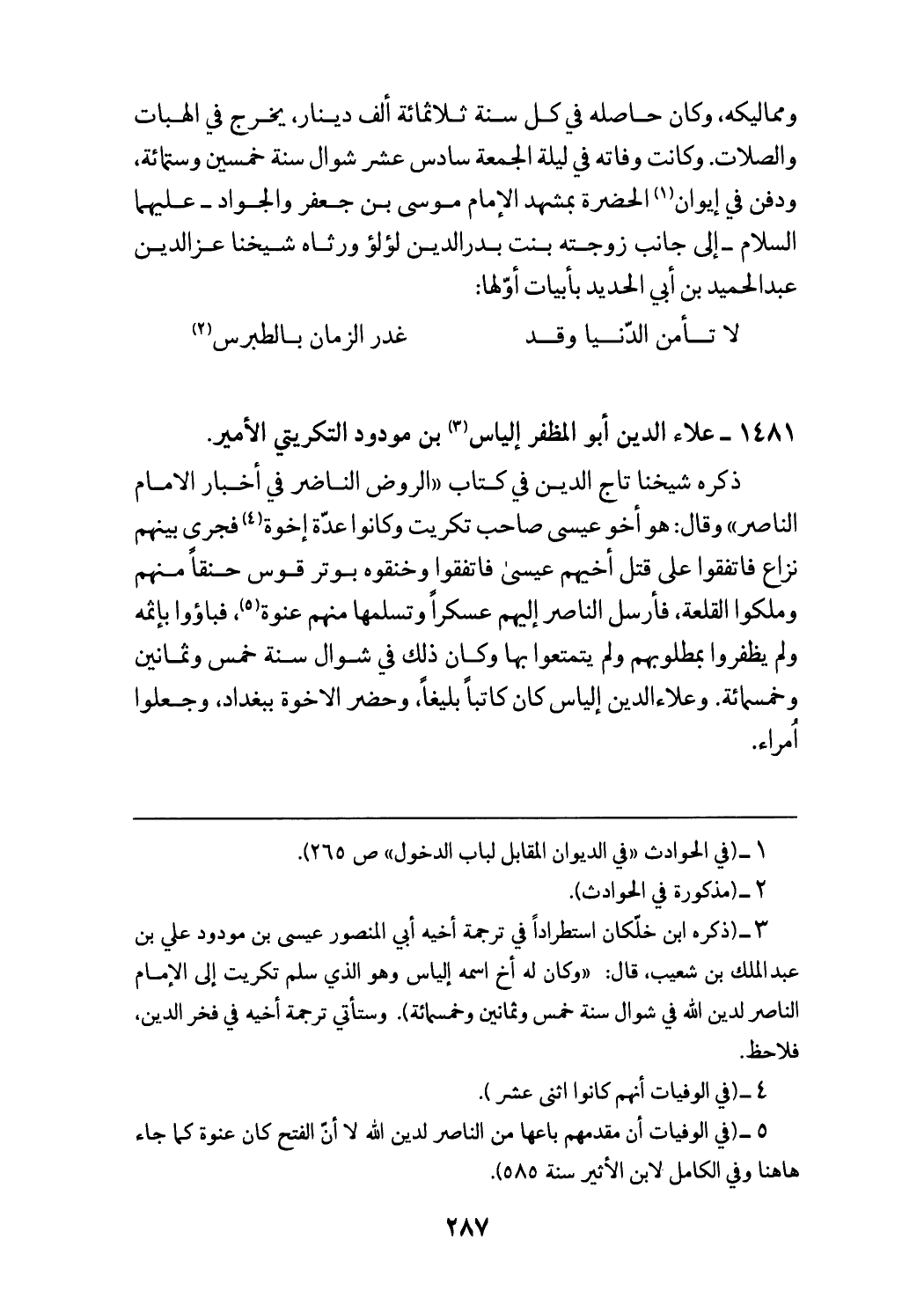 ذكره شيخنا تاج الدين في كتاب «الروض الناضر في أخبار الامام الناصر» وقال: هو أخو عيسى صاحب تكريت وكانوا عدّة إخوة (¬4) فجرى بينهم نزاع فاتفقوا على قتل أخيهم عيسى فاتفقوا وخنقوه بوتر قوس حنقا منهم وملكوا القلعة، فأرسل الناصر إليهم عسكرا وتسلمها منهم عنوة (¬5)، فباءوا بإثمه ولم يظفروا بمطلوبهم ولم يتمتعوا بها وكان ذلك في شوال سنة خمس وثمانين وخمسمائة. وعلاء الدين إلياس كان كاتبا بليغا، وحضر الاخوة ببغداد، وجعلوا امراء.