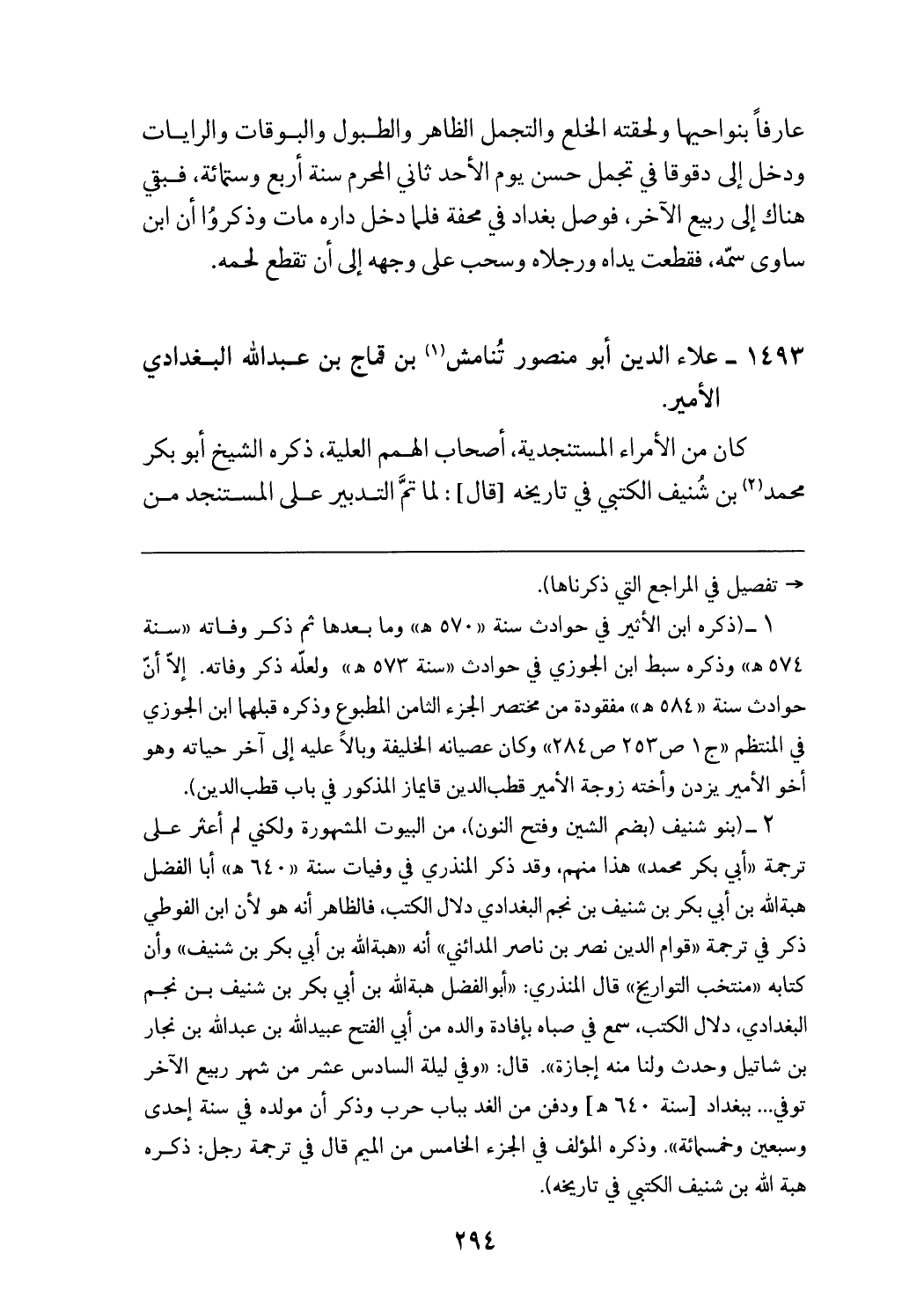 (¬2) (بنو شنيف (بضم الشين وفتح النون)، من البيوت المشهورة ولكني لم أعثر على ترجمة «أبي بكر محمد» هذا منهم، وقد ذكر المنذري في وفيات سنة «640 هـ» أبا الفضل هبة بن أبي بكر بن شنيف بن نجم البغدادي دلال الكتب، فالظاهر أنه هو لأن ابن الفوطي ذكر في ترجمة «قوام الدين نصر بن ناصر المدائني» أنه «هبة الله بن أبي بكر بن شنيف» وأن كتابه «منتخب التواريخ» قال المنذري: «أبو الفضل هبة الله بن أبي بكر بن شنيف بن نجم البغدادي، دلال الكتب، سمع في صباه بإفادة والده من أبي الفتح عبيد الله بن عبد الله بن نجار بن شاتيل وحدث ولنا منه إجازة».قال: «وفي ليلة السادس عشر من شهر ربيع الآخر توفي ... ببغداد [سنة 640 هـ] ودفن من الغد بباب حرب وذكر أن مولده في سنة إحدى وسبعين وخمسمائة».وذكره المؤلف في الجزء الخامس من الميم قال في ترجمة رجل: ذكره هبة الله بن شنيف الكتبي في تاريخه).