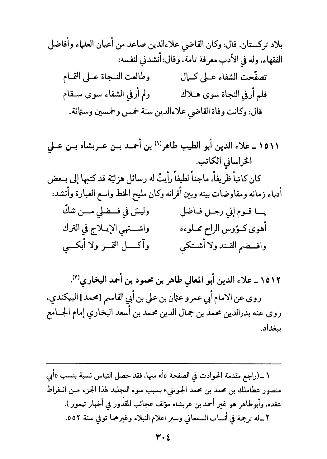 بلاد تركستان. قال: وكان القاضي علاء الدين صاعد من أعيان العلماء وأفاضل الفقهاء، وله في الأدب معرفة تامة، وقال: أنشدني لنفسه: