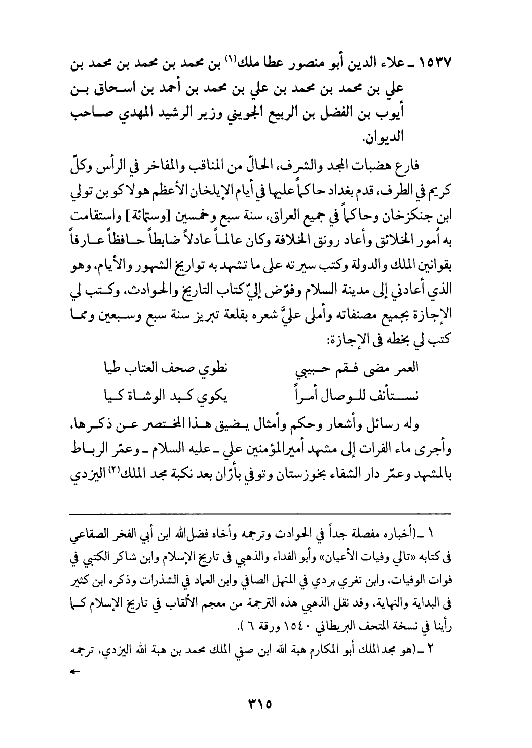 فارع هضبات المجد والشرف، الحالّ من المناقب والمفاخر في الرأس وكلّ كريم في الطرف، قدم بغداد حاكما عليها في أيام الإيلخان الأعظم هولاكو بن تولي ابن جنكزخان وحاكما في جميع العراق، سنة سبع وخمسين [وستمائة] واستقامت به امور الخلائق وأعاد رونق الخلافة وكان عالما عادلا ضابطا حافظا عارفا بقوانين الملك والدولة وكتب سيرته على ما تشهد به تواريخ الشهور والأيام، وهو الذي أعادني إلى مدينة السلام وفوّض إليّ كتاب التاريخ والحوادث، وكتب لي الإجازة بجميع مصنفاته وأملى عليّ شعره بقلعة تبريز سنة سبع وسبعين ومما كتب لي بخطه في الإجازة: