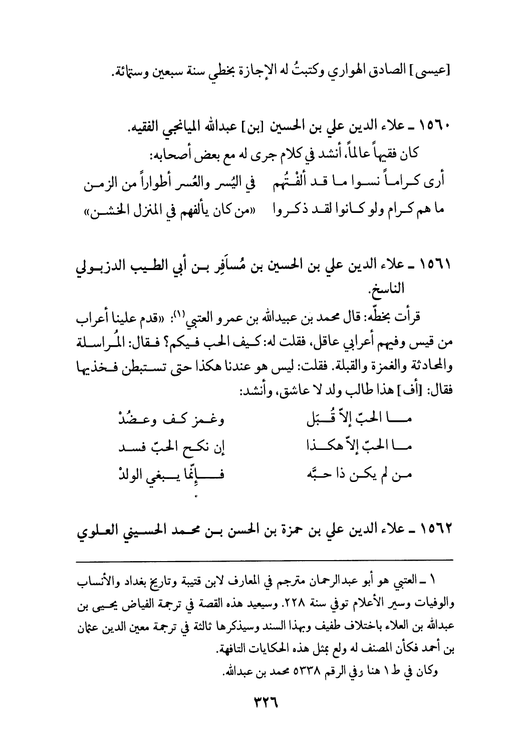 (¬1) العتبي هو أبو عبد الرحمن مترجم في المعارف لابن قتيبة وتاريخ بغداد والأنساب والوفيات وسير الأعلام توفي سنة 228.وسيعيد هذه القصة في ترجمة الفياض يحيى بن عبد الله بن العلاء باختلاف طفيف وبهذا السند وسيذكرها ثالثة في ترجمة معين الدين عثمان بن أحمد فكأن المصنف له ولع بمثل هذه الحكايات التافهة. وكان في ط 1 هنا وفي الرقم 5338 محمد بن عبد الله.