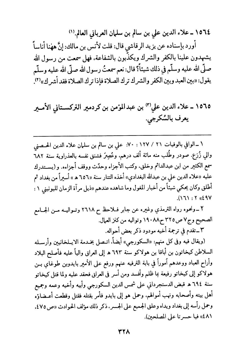 (¬1) الوافي بالوفيات 127/ 21: 70: علي بن سالم بن سلمان علاء الدين الحصني والي زرع. صودر وطلب منه مائة ألف درهم، وعصر فشنق نفسه بالعذراوية سنة 682 سمع الكثير من ابن عبد الدائم وخلق، وكتب الأجزاء وحدّث ووقف أجزاءه. و (يستدرك عليه «علاء الدين علي بن عبد الله البغدادي» أخذه التتار سنة «656 هـ» أسيرا من بغداد ثم أطلق وكان يحكي شيئا من أخبار المغول وما شاهده عندهم «ذيل مرآة الزمان لليونيني 1: 497» 2: 161).