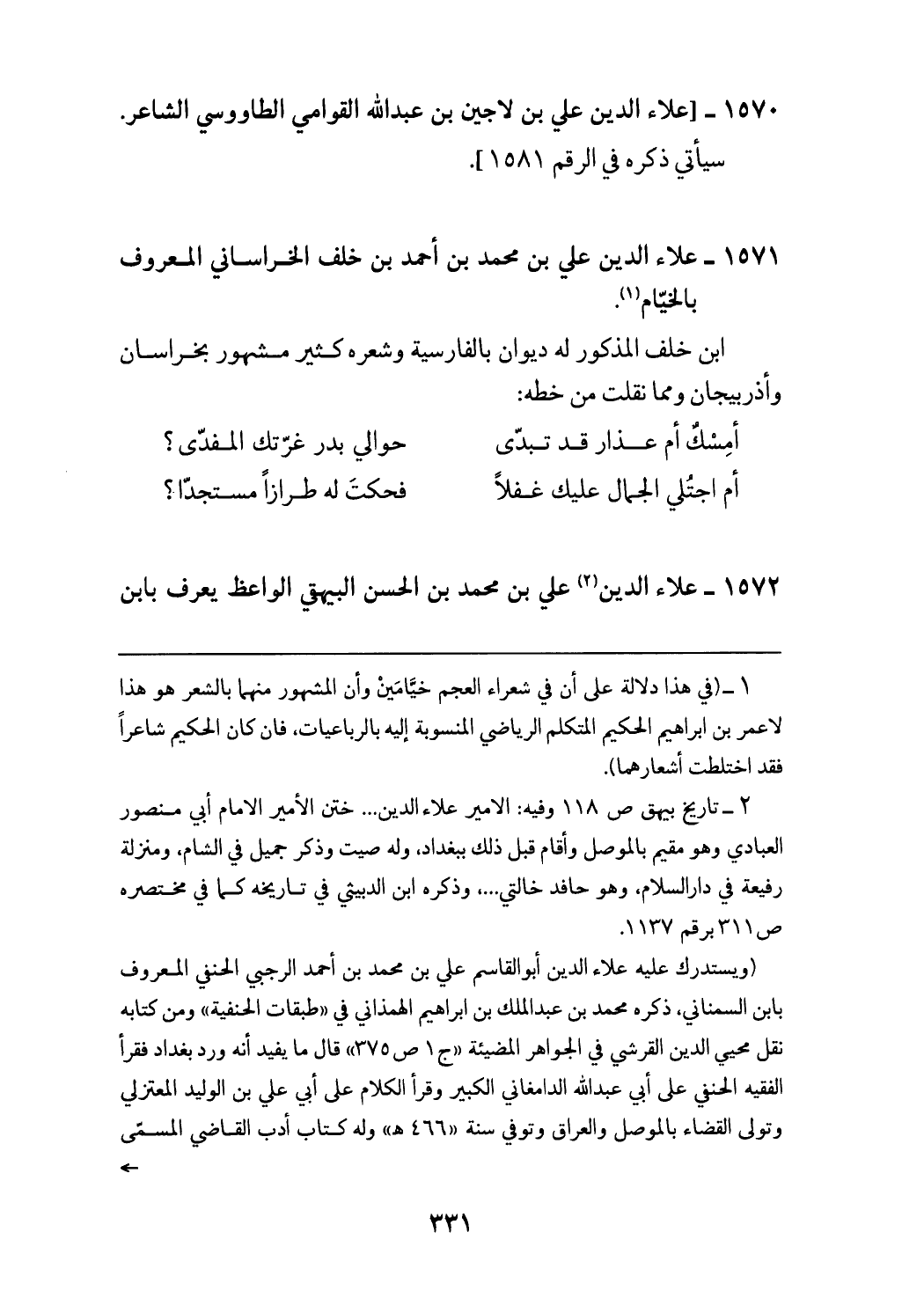 (¬1) (في هذا دلالة على أن في شعراء العجم خيّامين وأن المشهور منهما بالشعر هو هذا لا عمر بن ابراهيم الحكيم المتكلم الرياضي المنسوبة إليه بالرباعيات، فان كان الحكيم شاعرا فقد اختلطت أشعارهما).