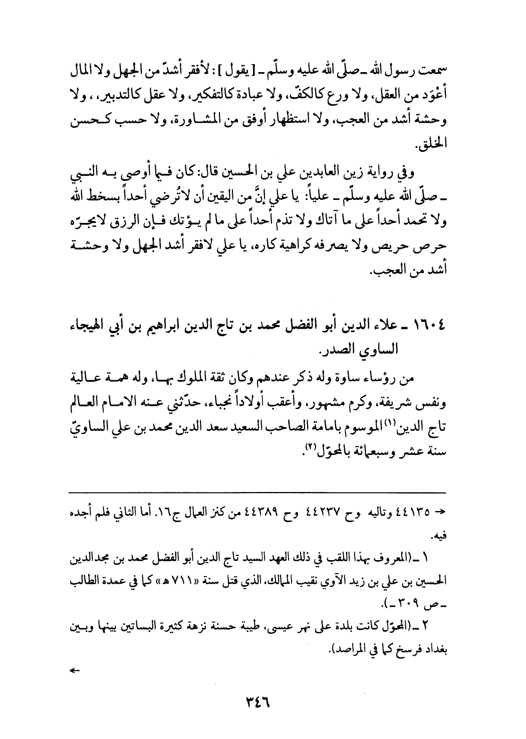 (¬1) (المعروف بهذا اللقب في ذلك العهد السيد تاج الدين أبو الفضل محمد بن مجد الدين الحسين بن علي بن زيد الآوي نقيب الممالك، الذي قتل سنة «711 هـ» كما في عمدة الطالب - ص 309 -).