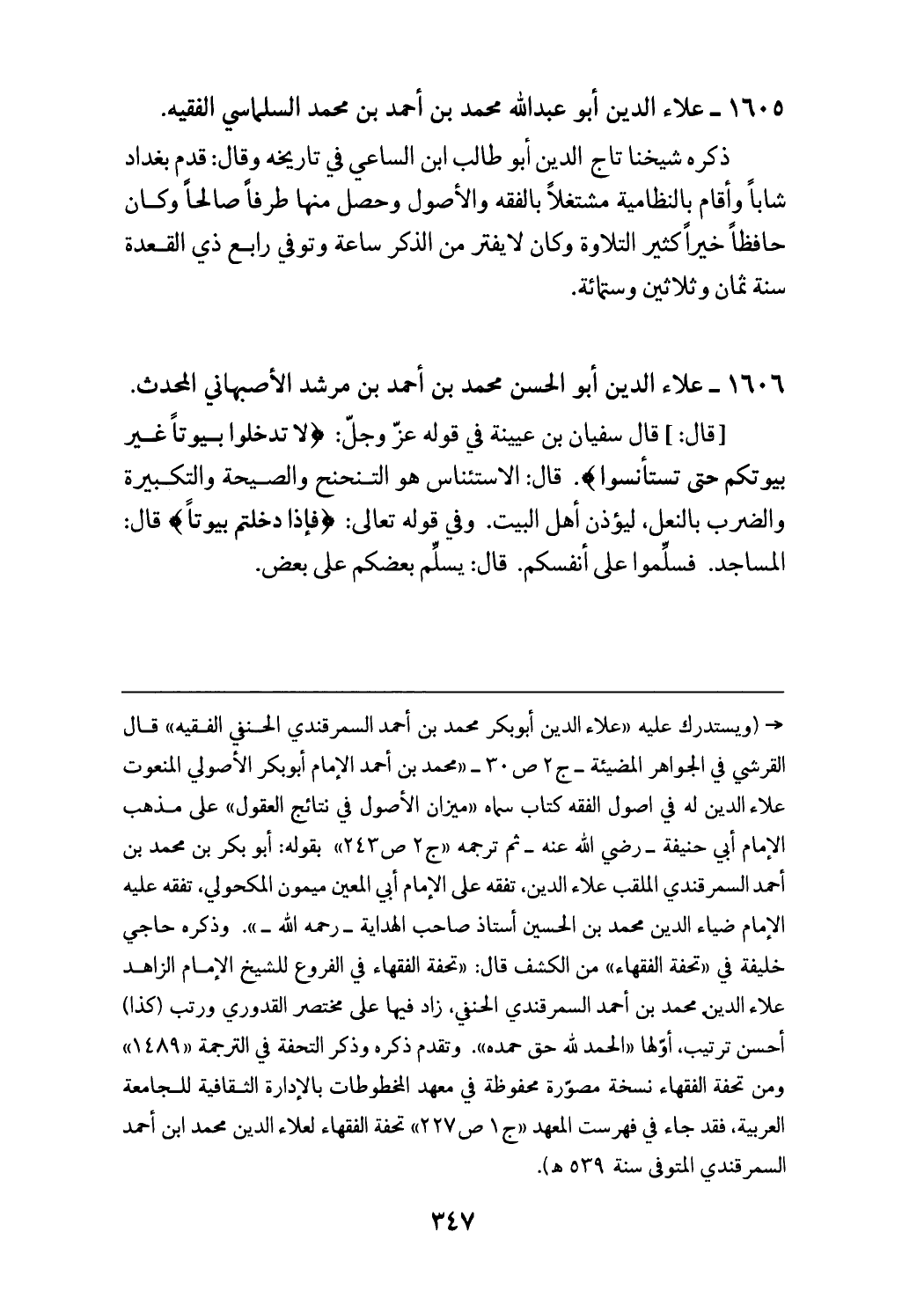 (ويستدرك عليه «علاء الدين أبو بكر محمد بن أحمد السمرقندي الحنفي الفقيه» قال القرشي في الجواهر المضيئة - ج 2 ص 30 - «محمد بن أحمد الإمام أبو بكر الأصولي المنعوت علاء الدين له في اصول الفقه كتاب سماه «ميزان الأصول في نتائج العقول» على مذهب الإمام أبي حنيفة - رضي الله عنه - ثم ترجمه «ج 2 ص 243» بقوله: أبو بكر بن محمد بن أحمد السمرقندي الملقب علاء الدين، تفقه على الإمام أبي المعين ميمون المكحولي، تفقه عليه الإمام ضياء الدين محمد بن الحسين أستاذ صاحب الهداية - رحمه الله -».وذكره حاجي خليفة في «تحفة الفقهاء» من الكشف قال: «تحفة الفقهاء في الفروع للشيخ الإمام الزاهد علاء الدين محمد بن أحمد السمرقندي الحنفي، زاد فيها على مختصر القدوري ورتب (كذا) أحسن ترتيب، أوّلها «الحمد لله حق حمده».وتقدم ذكره وذكر التحفة في الترجمة «1489» ومن تحفة الفقهاء نسخة مصوّرة محفوظة في معهد المخطوطات بالإدارة الثقافية للجامعة العربية، فقد جاء في فهرست المعهد «ج 1 ص 227» تحفة الفقهاء لعلاء الدين محمد ابن أحمد السمرقندي المتوفى سنة 539 هـ).
