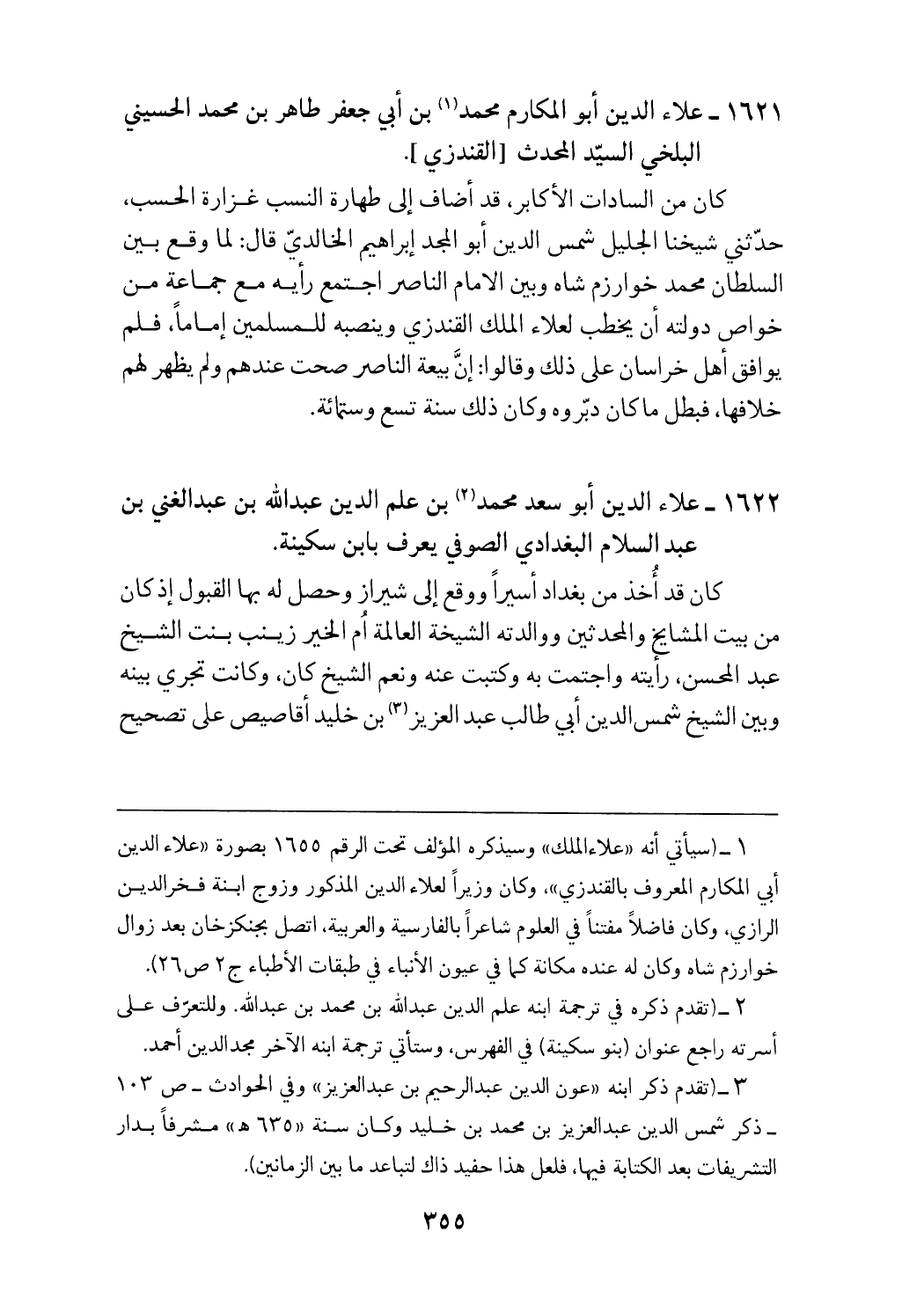 (¬1) (سيأتي أنه «علاء الملك» وسيذكره المؤلف تحت الرقم 1655 بصورة «علاء الدين أبي المكارم المعروف بالقندزي»، وكان وزيرا لعلاء الدين المذكور وزوج ابنة فخر الدين الرازي، وكان فاضلا مفتنا في العلوم شاعرا بالفارسية والعربية، اتصل بجنكزخان بعد زوال خوارزم شاه وكان له عنده مكانة كما في عيون الأنباء في طبقات الأطباء ج 2 ص 26).