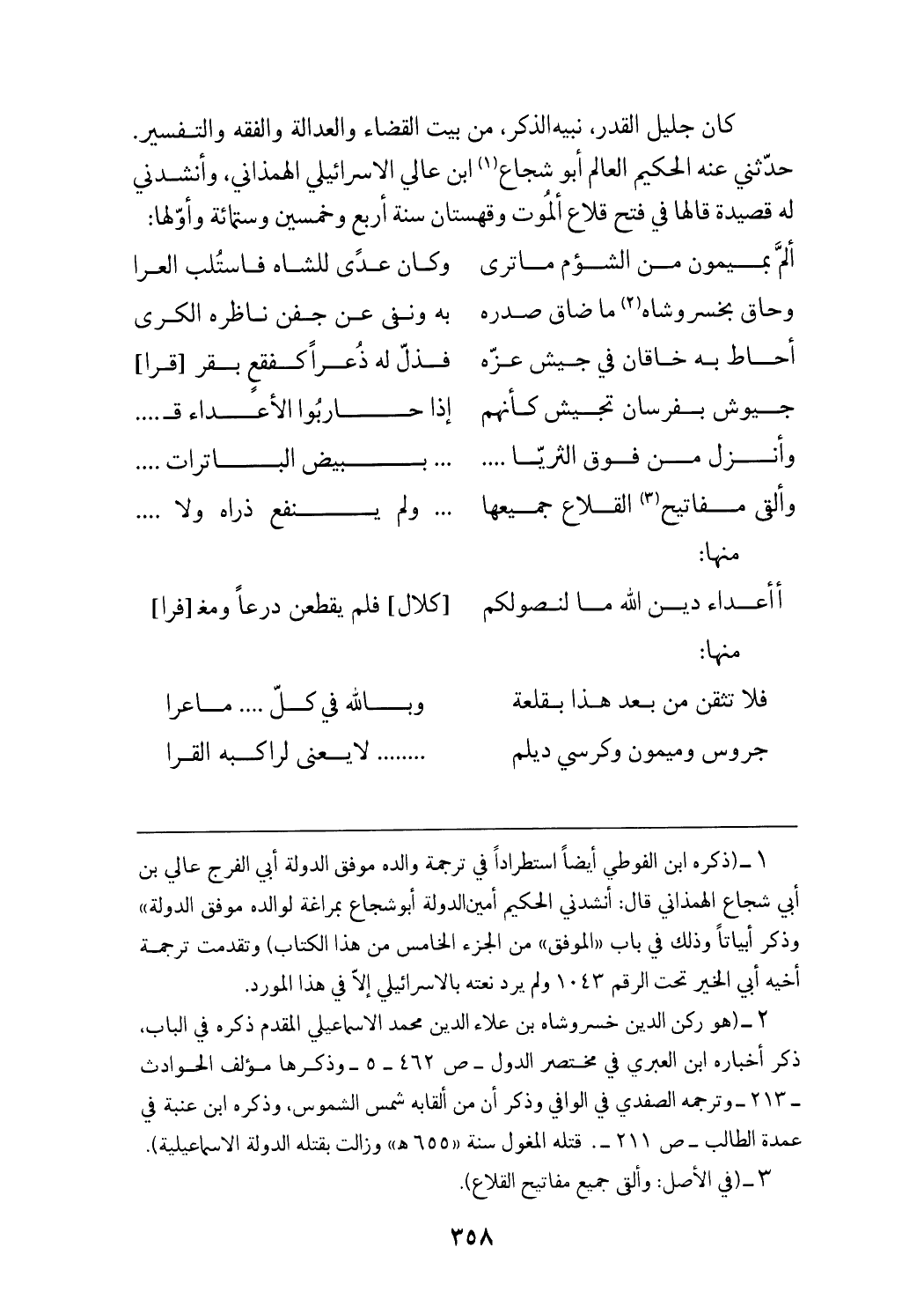 (¬2) (هو ركن الدين خسرو شاه بن علاء الدين محمد الاسماعيلي المقدم ذكره في الباب، ذكر أخباره ابن العبري في مختصر الدول - ص 462 - 5 - وذكرها مؤلف الحوادث - 213 - وترجمه الصفدي في الوافي وذكر أن من ألقابه شمس الشموس، وذكره ابن عنبة في عمدة الطالب - ص 211 - .قتله المغول سنة «655 هـ» وزالت بقتله الدولة الاسماعيلية).