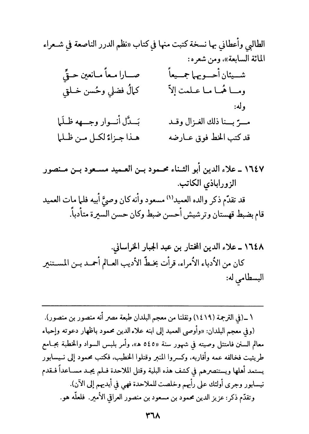 (¬1) (في الترجمة (1419) ونقلنا من معجم البلدان طبعة مصر أنه منصور بن منصور). (وفي معجم البلدان: «وأوصى العميد إلى ابنه علاء الدين محمود باظهار دعوته وإحياء معالم السنن فامتثل وصيته في شهور سنة «545 هـ»، وأمر بلبس السواد والخطبة بجامع طريثيث فخالفه عمه وأقاربه، وكسروا المنبر وقتلوا الخطيب، فكتب محمود إلى نيسابور يستمد أهلها ويستنصرهم في كشف هذه البلية وقتل الملاحدة فلم يجد مساعدا فقدم نيسابور وجرى أولئك على رأيهم وخلصت للملاحدة فهي في أيديهم إلى الآن). وتقدّم ذكر: عزيز الدين محمود بن مسعود بن منصور العراقي الأمير. فلعلّه هو.
