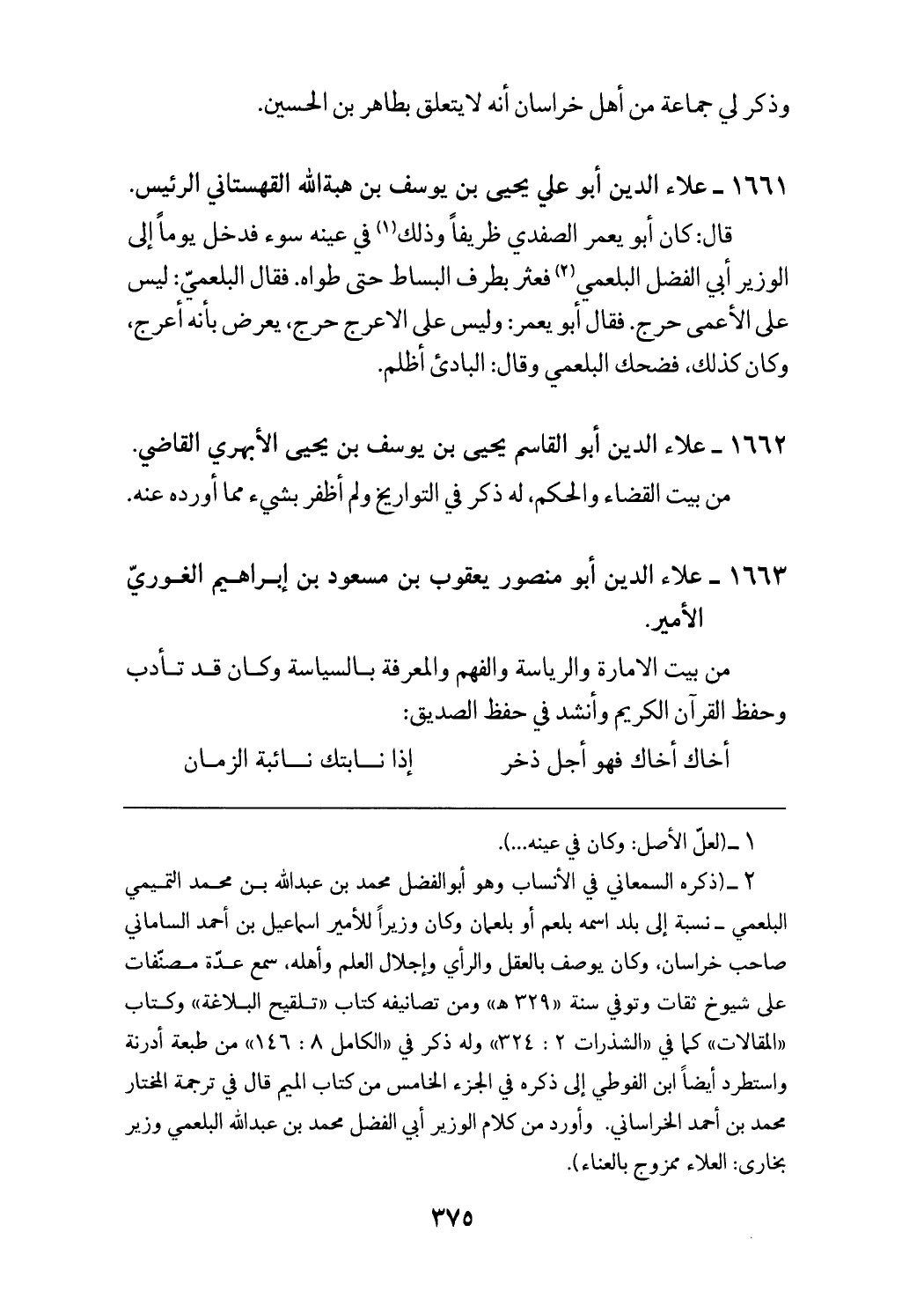 (¬2) (ذكره السمعاني في الأنساب وهو أبو الفضل محمد بن عبد الله بن محمد التميمي البلعمي - نسبة إلى بلد اسمه بلعم أو بلعمان وكان وزيرا للأمير اسماعيل بن أحمد الساماني صاحب خراسان، وكان يوصف بالعقل والرأي وإجلال العلم وأهله، سمع عدّة مصنّفات على شيوخ ثقات وتوفي سنة «329 هـ» ومن تصانيفه كتاب «تلقيح البلاغة» وكتاب «المقالات» كما في «الشذرات 2: 324» وله ذكر في «الكامل 8: 146» من طبعة أدرنة واستطرد أيضا ابن الفوطي إلى ذكره في الجزء الخامس من كتاب الميم قال في ترجمة المختار محمد بن أحمد الخراساني. وأورد من كلام الوزير أبي الفضل محمد بن عبد الله البلعمي وزير بخارى: العلاء ممزوج بالعناء).