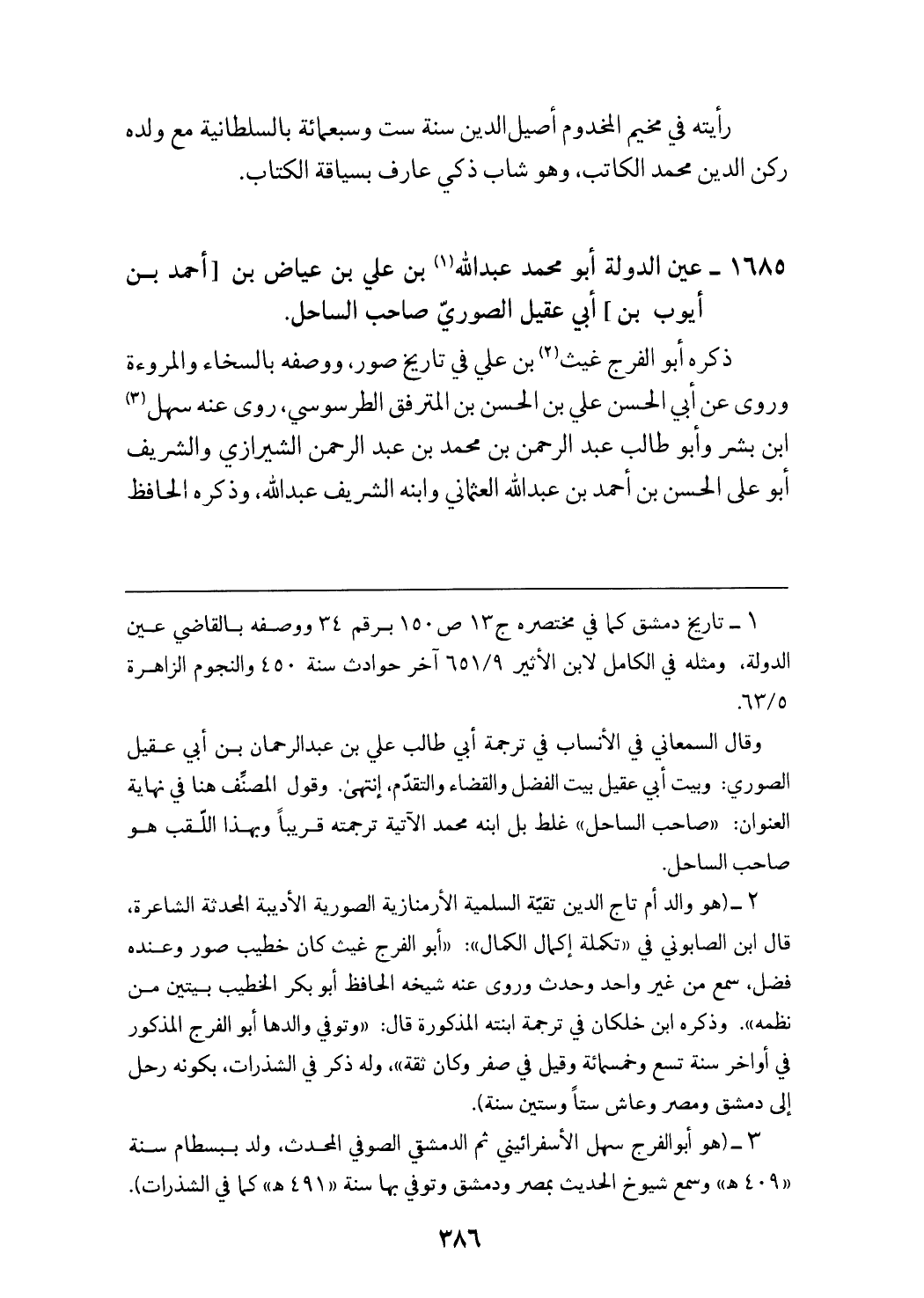 (¬1) تاريخ دمشق كما في مختصره ج 13 ص 150 برقم 34 ووصفه بالقاضي عين الدولة، ومثله في الكامل لابن الأثير 651/ 9 آخر حوادث سنة 450 والنجوم الزاهرة 63/ 5. وقال السمعاني في الأنساب في ترجمة أبي طالب علي بن عبد الرحمن بن أبي عقيل الصوري: وبيت أبي عقيل بيت الفضل والقضاء والتقدّم، انتهى. وقول المصنّف هنا في نهاية العنوان: «صاحب الساحل» غلط بل ابنه محمد الآتية ترجمته قريبا وبهذا اللّقب هو صاحب الساحل.
