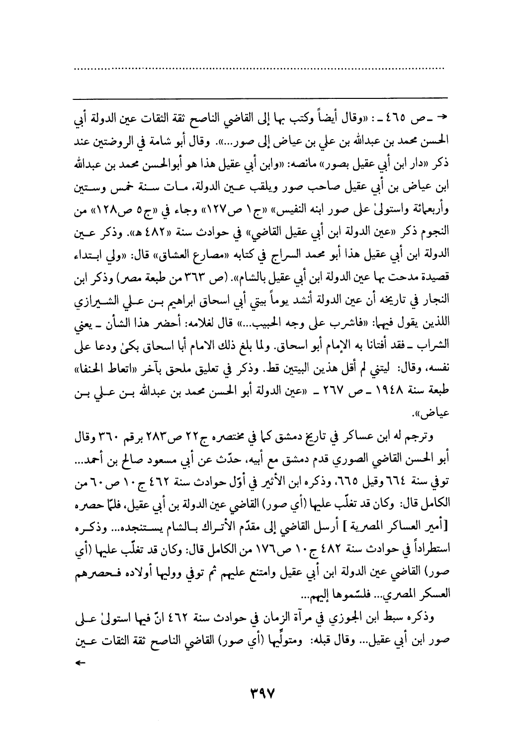 - ص 465 - : «وقال أيضا وكتب بها إلى القاضي الناصح ثقة الثقات عين الدولة أبي الحسن محمد بن عبد الله بن علي بن عياض إلى صور ...».وقال أبو شامة في الروضتين عند ذكر «دار ابن أبي عقيل بصور» ما نصه: «وابن أبي عقيل هذا هو أبو الحسن محمد بن عبد الله ابن عياض بن أبي عقيل صاحب صور ويلقب عين الدولة، مات سنة خمس وستين وأربعمائة واستولى على صور ابنه النفيس» «ج 1 ص 127» وجاء في «ج 5 ص 128» من النجوم ذكر «عين الدولة ابن أبي عقيل القاضي» في حوادث سنة «482 هـ».وذكر عين الدولة ابن أبي عقيل هذا أبو محمد السراج في كتابه «مصارع العشاق» قال: «ولي ابتداء قصيدة مدحت بها عين الدولة ابن أبي عقيل بالشام». (ص 363 من طبعة مصر) وذكر ابن النجار في تاريخه أن عين الدولة أنشد يوما بيتي أبي اسحاق ابراهيم بن علي الشيرازي اللذين يقول فيهما: «فاشرب على وجه الحبيب ...» قال لغلامه: أحضر هذا الشأن - يعني الشراب - فقد أفتانا به الإمام أبو اسحاق. ولما بلغ ذلك الامام أبا اسحاق بكى ودعا على نفسه، وقال: ليتني لم أقل هذين البيتين قط. وذكر في تعليق ملحق بآخر «اتعاظ الحنفا» طبعة سنة 1948 - ص 267 - «عين الدولة أبو الحسن محمد بن عبد الله بن علي بن عياض». وترجم له ابن عساكر في تاريخ دمشق كما في مختصره ج 22 ص 283 برقم 360 وقال أبو الحسن القاضي الصوري قدم دمشق مع أبيه، حدّث عن أبي مسعود صالح بن أحمد ... توفي سنة 664 وقيل 665، وذكره ابن الأثير في أوّل حوادث سنة 462 ج 10 ص 60 من الكامل قال: وكان قد تغلّب عليها (أي صور) القاضي عين الدولة بن أبي عقيل، فلمّا حصره [أمير العساكر المصرية] أرسل القاضي إلى مقدّم الأتراك بالشام يستنجده ... وذكره استطرادا في حوادث سنة 482 ج 10 ص 176 من الكامل قال: وكان قد تغلّب عليها (أي صور) القاضي عين الدولة ابن أبي عقيل وامتنع عليهم ثم توفي ووليها أولاده فحصرهم العسكر المصري ... فلسّموها إليهم ... وذكره سبط ابن الجوزي في مرآة الزمان في حوادث سنة 462 انّ فيها استولى على صور ابن أبي عقيل ... وقال قبله: ومتولّيها (أي صور) القاضي الناصح ثقة الثقات عين