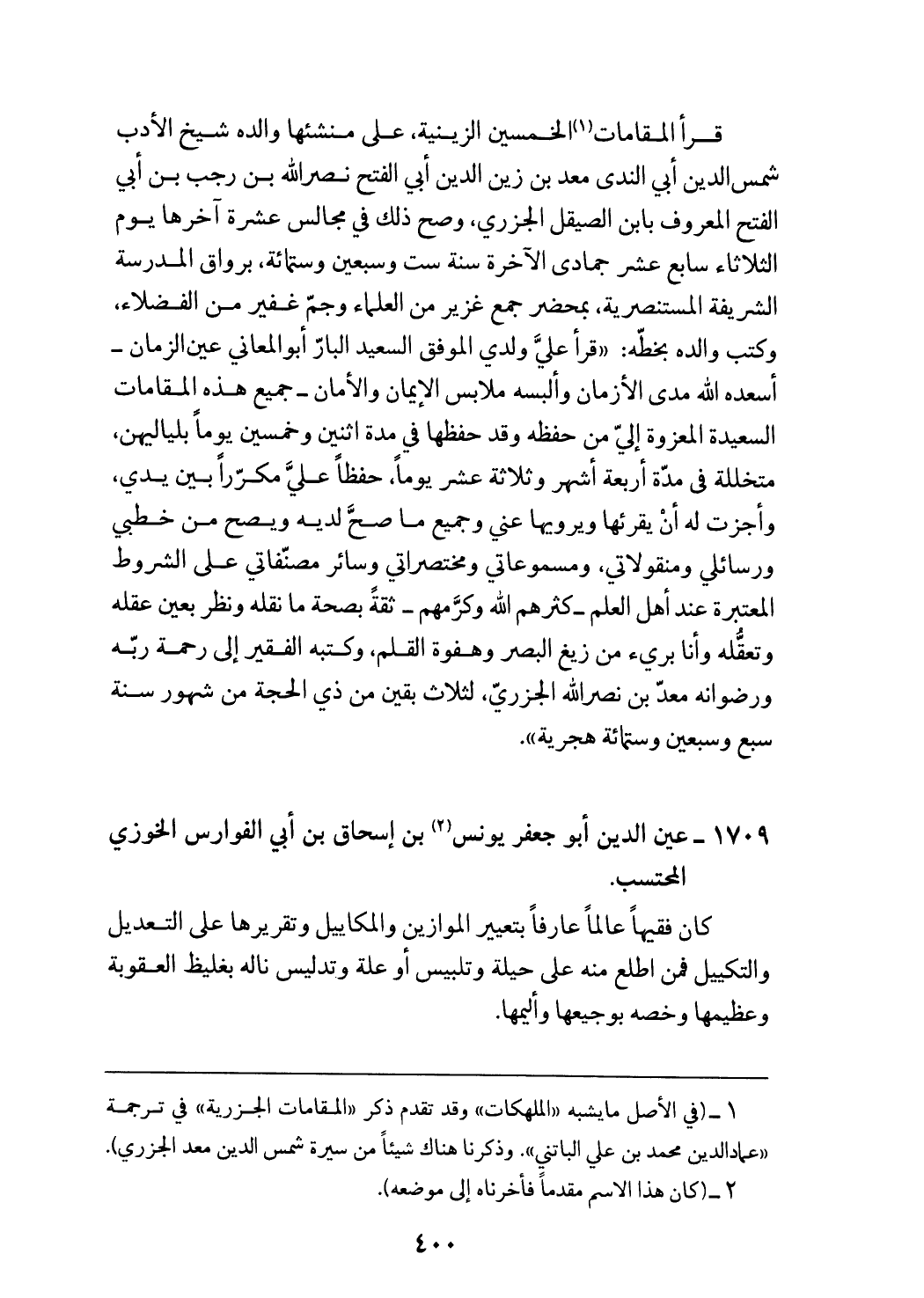 (¬1) (في الأصل ما يشبه «الملهكات» وقد تقدم ذكر «المقامات الجزرية» في ترجمة «عماد الدين محمد بن علي الباتني».وذكرنا هناك شيئا من سيرة شمس الدين معد الجزري).