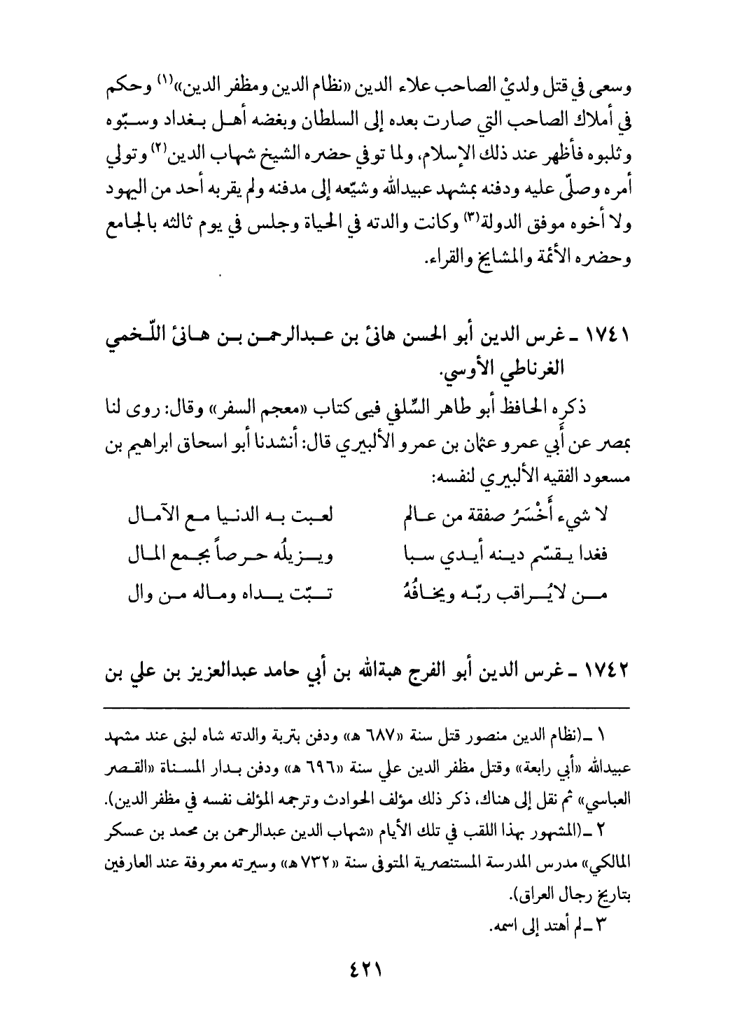 (¬2) (المشهور بهذا اللقب في تلك الأيام «شهاب الدين عبد الرحمن بن محمد بن عسكر المالكي» مدرس المدرسة المستنصرية المتوفى سنة «732 هـ» وسيرته معروفة عند العارفين بتاريخ رجال العراق).