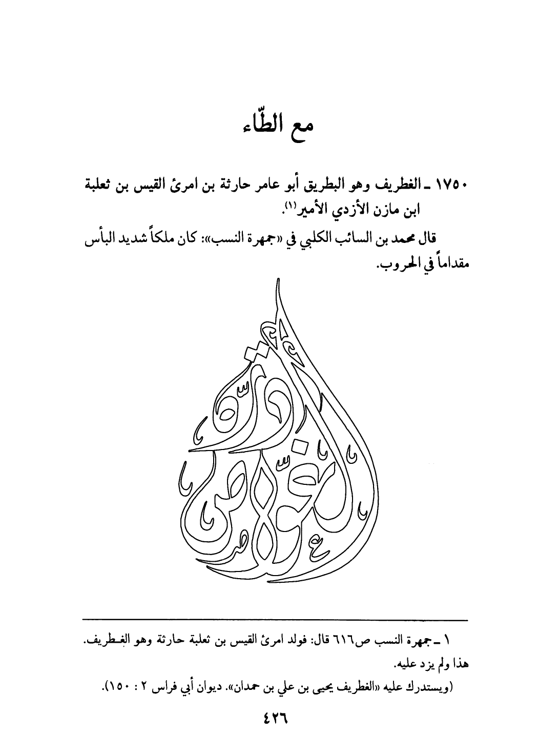 (¬1) جمهرة النسب ص 616 قال: فولد امرئ القيس بن ثعلبة حارثة وهو الغطريف. هذا ولم يزد عليه. (ويستدرك عليه «الغطريف يحيى بن علي بن حمدان».ديوان أبي فراس 2: 150).