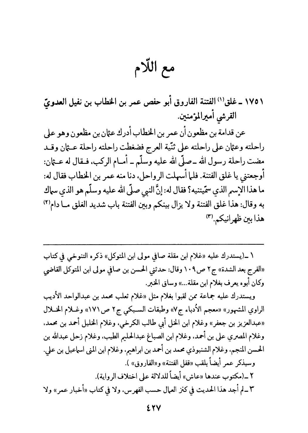 1751 - غلق (¬1) الفتنة الفاروق أبو حفص عمر بن الخطاب بن نفيل العدويّ