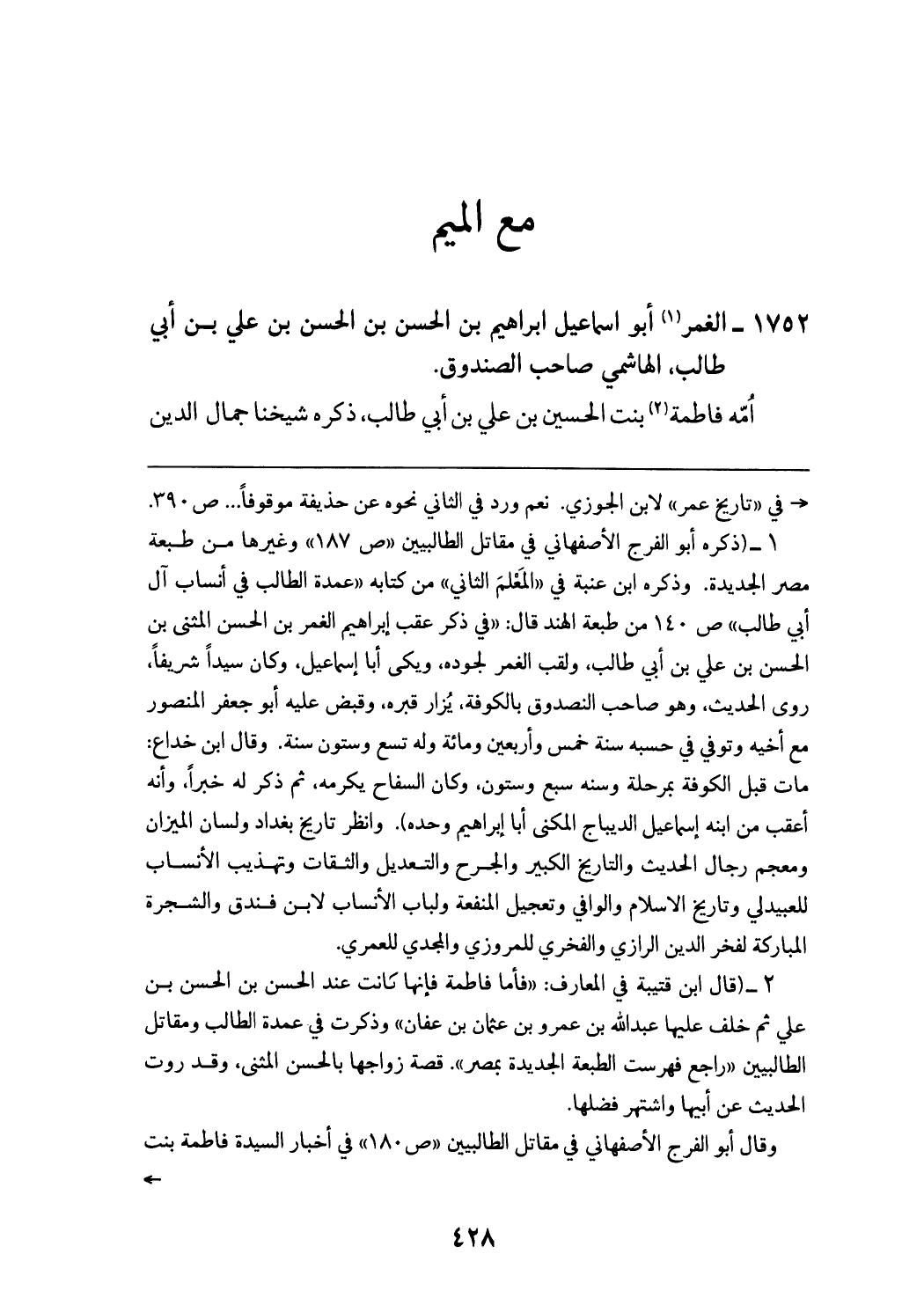 (¬1) (ذكره أبو الفرج الأصفهاني في مقاتل الطالبيين «ص 187» وغيرها من طبعة مصر الجديدة. وذكره ابن عنبة في «المعلم الثاني» من كتابه «عمدة الطالب في أنساب آل أبي طالب» ص 140 من طبعة الهند قال: «في ذكر عقب إبراهيم الغمر بن الحسن المثنى بن الحسن بن علي بن أبي طالب، ولقب الغمر لجوده، ويكى أبا إسماعيل، وكان سيدا شريفا، روى الحديث، وهو صاحب الصندوق بالكوفة، يزار قبره، وقبض عليه أبو جعفر المنصور مع أخيه وتوفي في حسبه سنة خمس وأربعين ومائة وله تسع وستون سنة. وقال ابن خداع: مات قبل الكوفة بمرحلة وسنه سبع وستون، وكان السفاح يكرمه، ثم ذكر له خبرا، وأنه أعقب من ابنه إسماعيل الديباج المكنى أبا إبراهيم وحده). وانظر تاريخ بغداد ولسان الميزان ومعجم رجال الحديث والتاريخ الكبير والجرح والتعديل والثقات وتهذيب الأنساب للعبيد لي وتاريخ الاسلام والوافي وتعجيل المنفعة ولباب الأنساب لابن فندق والشجرة المباركة لفخر الدين الرازي والفخري للمروزي والمجدي للعمري.