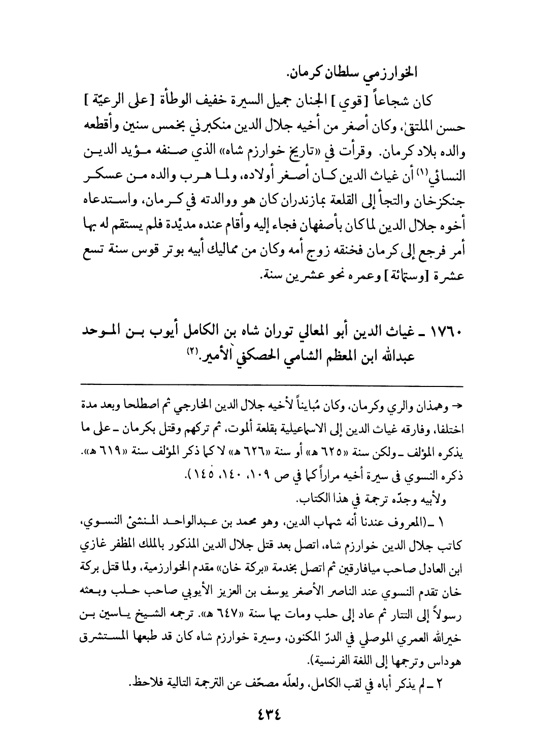 = وهمذان والري وكرمان، وكان مباينا لأخيه جلال الدين الخارجي ثم اصطلحا وبعد مدة اختلفا، وفارقه غياث الدين إلى الاسماعيلية بقلعة ألموت، ثم تركهم وقتل بكرمان - على ما يذكره المؤلف - ولكن سنة «625 هـ» أو سنة «626 هـ» لا كما ذكر المؤلف سنة «619 هـ». ذكره النسوي في سيرة أخيه مرارا كما في ص 109، 140، 145). ولأبيه وجدّه ترجمة في هذا الكتاب.