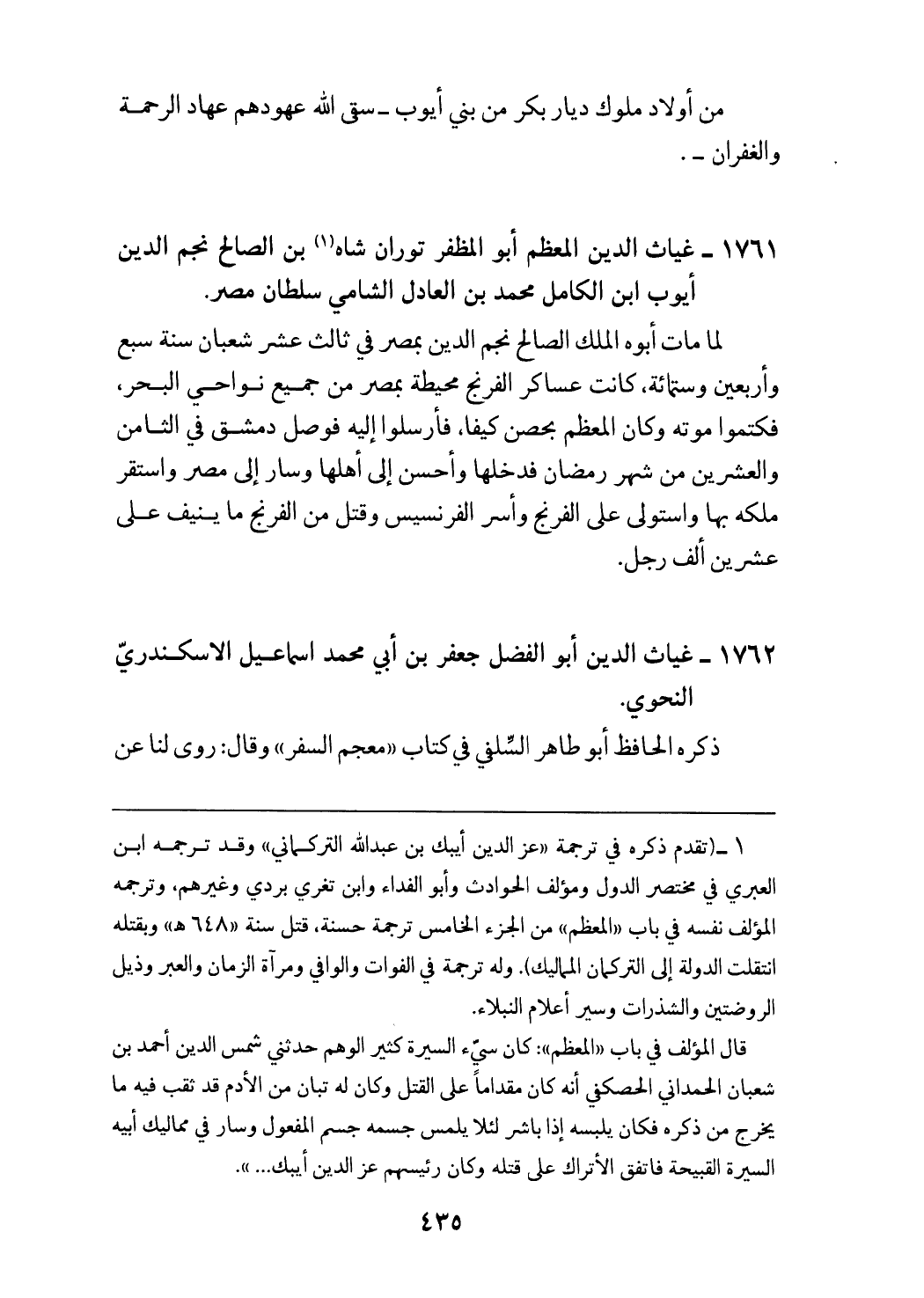 (¬1) (تقدم ذكره في ترجمة «عزّ الدين أيبك بن عبد الله التركماني» وقد ترجمه ابن العبري في مختصر الدول ومؤلف الحوادث وأبو الفداء وابن تغري بردي وغيرهم، وترجمه المؤلف نفسه في باب «المعظم» من الجزء الخامس ترجمة حسنة، قتل سنة «648 هـ» وبقتله انتقلت الدولة إلى التركمان المماليك). وله ترجمة في الفوات والوافي ومرآة الزمان والعبر وذيل الروضتين والشذرات وسير أعلام النبلاء. قال المؤلف في باب «المعظم»: كان سيّء السيرة كثير الوهم حدثني شمس الدين أحمد بن شعبان الحمداني الحصكفي أنه كان مقداما على القتل وكان له تبان من الأدم قد ثقب فيه ما يخرج من ذكره فكان يلبسه إذا باشر لئلا يلمس جسمه جسم المفعول وسار في مماليك أبيه السيرة القبيحة فاتفق الأتراك على قتله وكان رئيسهم عزّ الدين أيبك ...».