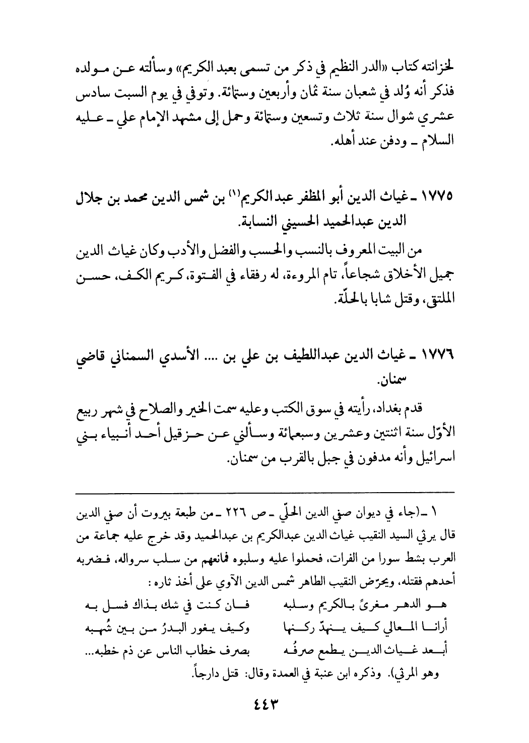 (¬1) (جاء في ديوان صفي الدين الحلّي - ص 226 - من طبعة بيروت أن صفي الدين قال يرثي السيد النقيب غياث الدين عبد الكريم بن عبد الحميد وقد خرج عليه جماعة من العرب بشط سورا من الفرات، فحملوا عليه وسلبوه فمانعهم من سلب سرواله، فضربه أحدهم فقتله، ويحرّض النقيب الطاهر شمس الدين الآوي على أخذ ثاره:
