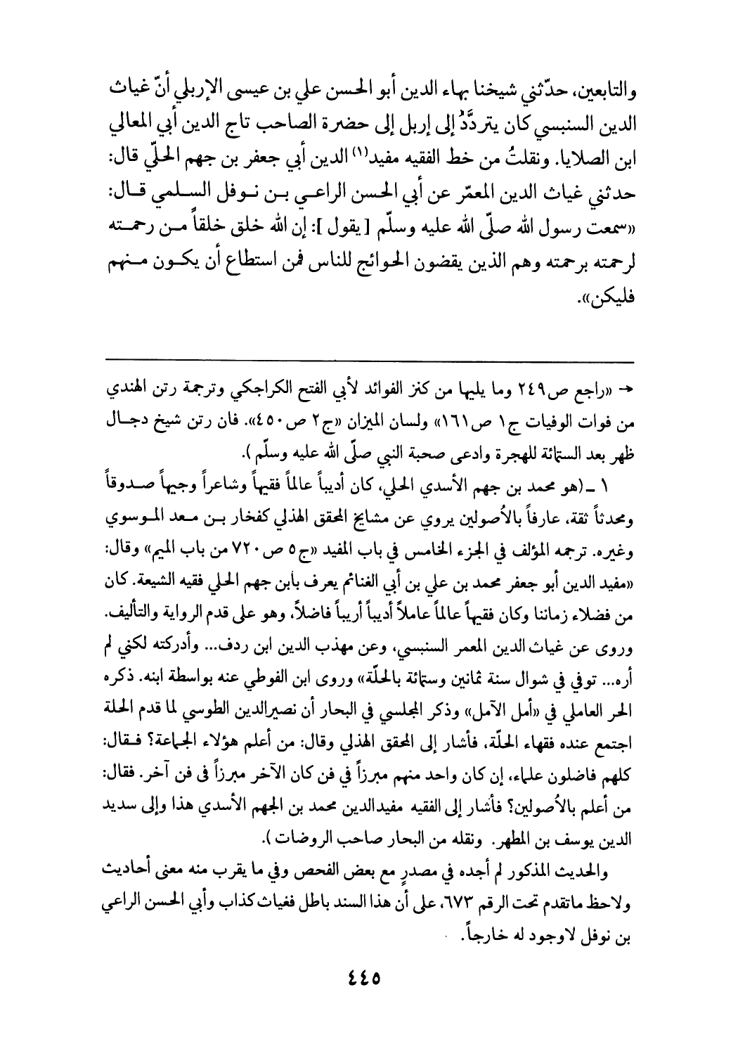 (¬1) (هو محمد بن جهم الأسدي الحلي، كان أديبا عالما فقيها وشاعرا وجيها صدوقا ومحدثا ثقة، عارفا بالاصولين يروي عن مشايخ المحقق الهذلي كفخار بن معد الموسوي وغيره. ترجمه المؤلف في الجزء الخامس في باب المفيد «ج 5 ص 720 من باب الميم» وقال: «مفيد الدين أبو جعفر محمد بن علي بن أبي الغنائم يعرف بابن جهم الحلي فقيه الشيعة. كان من فضلاء زماننا وكان فقيها عالما عاملا أديبا أريبا فاضلا، وهو على قدم الرواية والتأليف. وروى عن غياث الدين المعمر السنبسي، وعن مهذب الدين ابن ردف ... وأدركته لكني لم أره ... توفي في شوال سنة ثمانين وستمائة بالحلّة» وروى ابن الفوطي عنه بواسطة ابنه. ذكره الحر العاملي في «أمل الآمل» وذكر المجلسي في البحار أن نصير الدين الطوسي لما قدم الحلة اجتمع عنده فقهاء الحلّة، فأشار إلى المحقق الهذلي وقال: من أعلم هؤلاء الجماعة؟ فقال: كلهم فاضلون علماء، إن كان واحد منهم مبرزا في فن كان الآخر مبرزا في فن آخر. فقال: من أعلم بالاصولين؟ فأشار إلى الفقيه مفيد الدين محمد بن الجهم الأسدي هذا وإلى سديد الدين يوسف بن المطهر. ونقله من البحار صاحب الروضات). والحديث المذكور لم أجده في مصدر مع بعض الفحص وفي ما يقرب منه معنى أحاديث ولاحظ ما تقدم تحت الرقم 673، على أن هذا السند باطل فغياث كذاب وأبي الحسن الراعي بن نوفل لا وجود له خارجا.