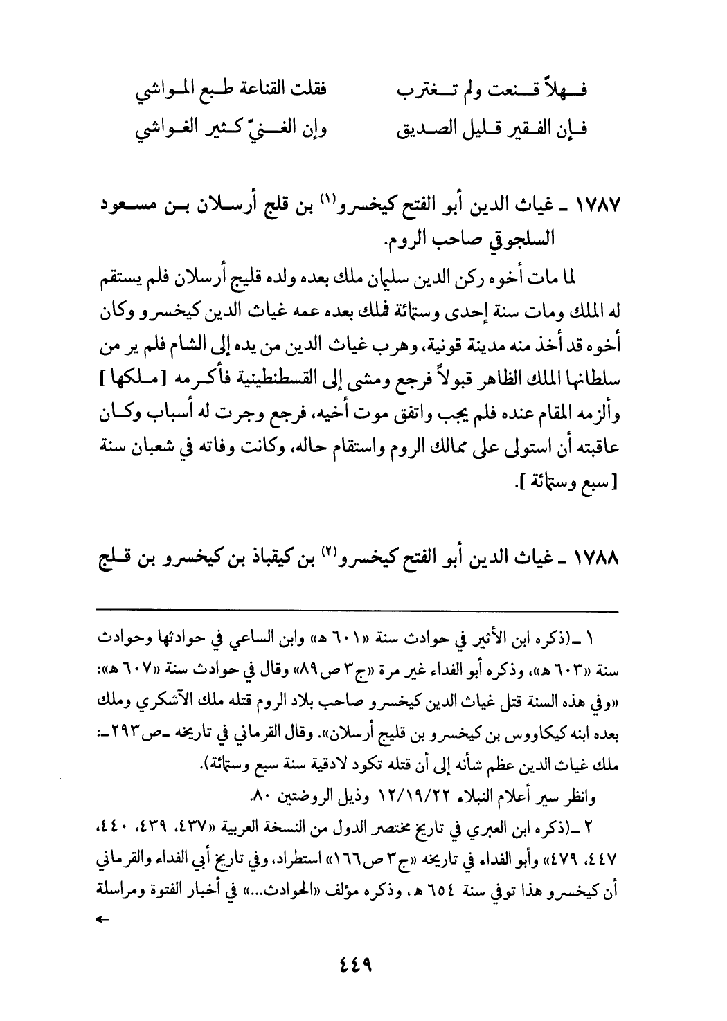 (¬2) (ذكره ابن العبري في تاريخ مختصر الدول من النسخة العربية «437، 439، 440، 447، 479» وأبو الفداء في تاريخه «ج 3 ص 166» استطراد، وفي تاريخ أبي الفداء والقرماني أن كيخسرو هذا توفي سنة 654 هـ، وذكره مؤلف «الحوادث ...» في أخبار الفتوة ومراسلة