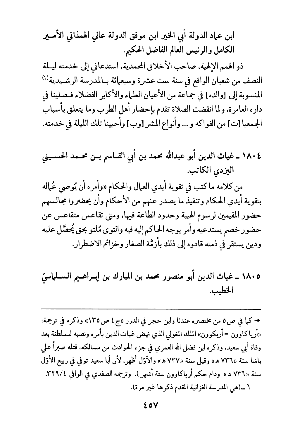 = كما في ص 5 من مختصره عندنا وابن حجر في الدرر «ج 4 ص 135» وذكره في ترجمة: «أرباكارون أربكوون» الملك المغولي الذي نهض غياث الدين بأمره ونصبه للسلطنة بعد وفاة أبي سعيد، وذكره ابن فضل الله العمري في جزء الحوادث من مسالكه، قتله صبرا علي باشا سنة «736 هـ» وقيل سنة «737 هـ» والأوّل أظهر، لأن أبا سعيد توفي في ربيع الأوّل سنة «736 هـ» ودام حكم أرباكاوون ستة أشهر). وترجمه الصفدي في الوافي 329/ 4.