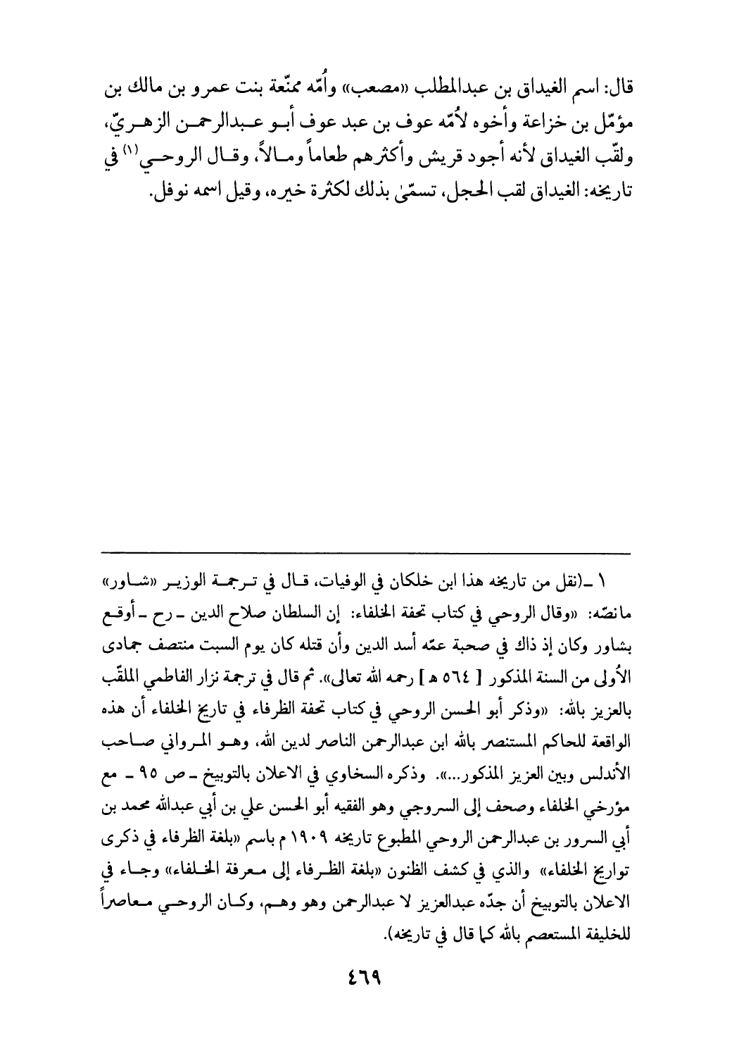 قال: اسم الغيداق بن عبد المطلب «مصعب» وأمّه ممنّعة بنت عمرو بن مالك بن مؤمّل بن خزاعة وأخوه لامّه عوف بن عبد عوف أبو عبد الرحمن الزهريّ، ولقّب الغيداق لأنه أجود قريش وأكثرهم طعاما ومالا، وقال الروحي (¬1) في تاريخه: الغيداق لقب الحجل، تسمّى بذلك لكثرة خيره، وقيل اسمه نوفل.