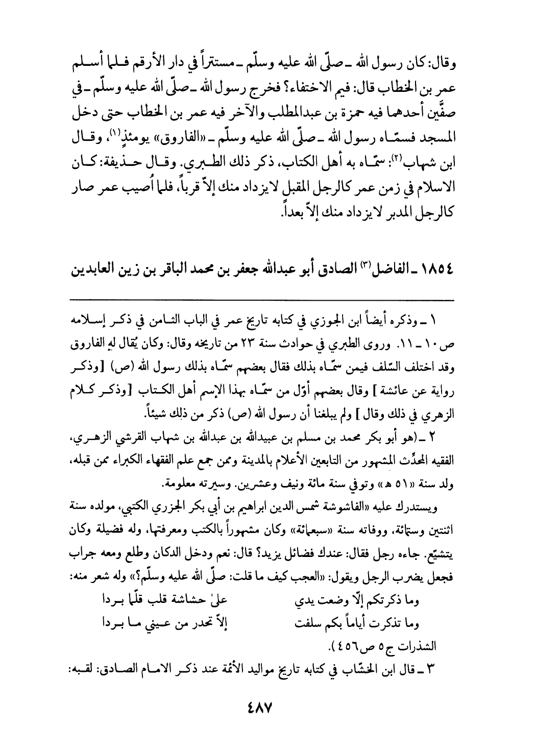 (¬1) وذكره أيضا ابن الجوزي في كتابه تاريخ عمر في الباب الثامن في ذكر إسلامه ص 10 - 11.وروى الطبري في حوادث سنة 23 من تاريخه وقال: وكان يقال له الفاروق وقد اختلف السّلف فيمن سمّاه بذلك فقال بعضهم سمّاه بذلك رسول الله (ص) [وذكر رواية عن عائشة] وقال بعضهم أوّل من سمّاه بهذا الاسم أهل الكتاب [وذكر كلام الزهري في ذلك وقال] ولم يبلغنا أن رسول الله (ص) ذكر من ذلك شيئا.