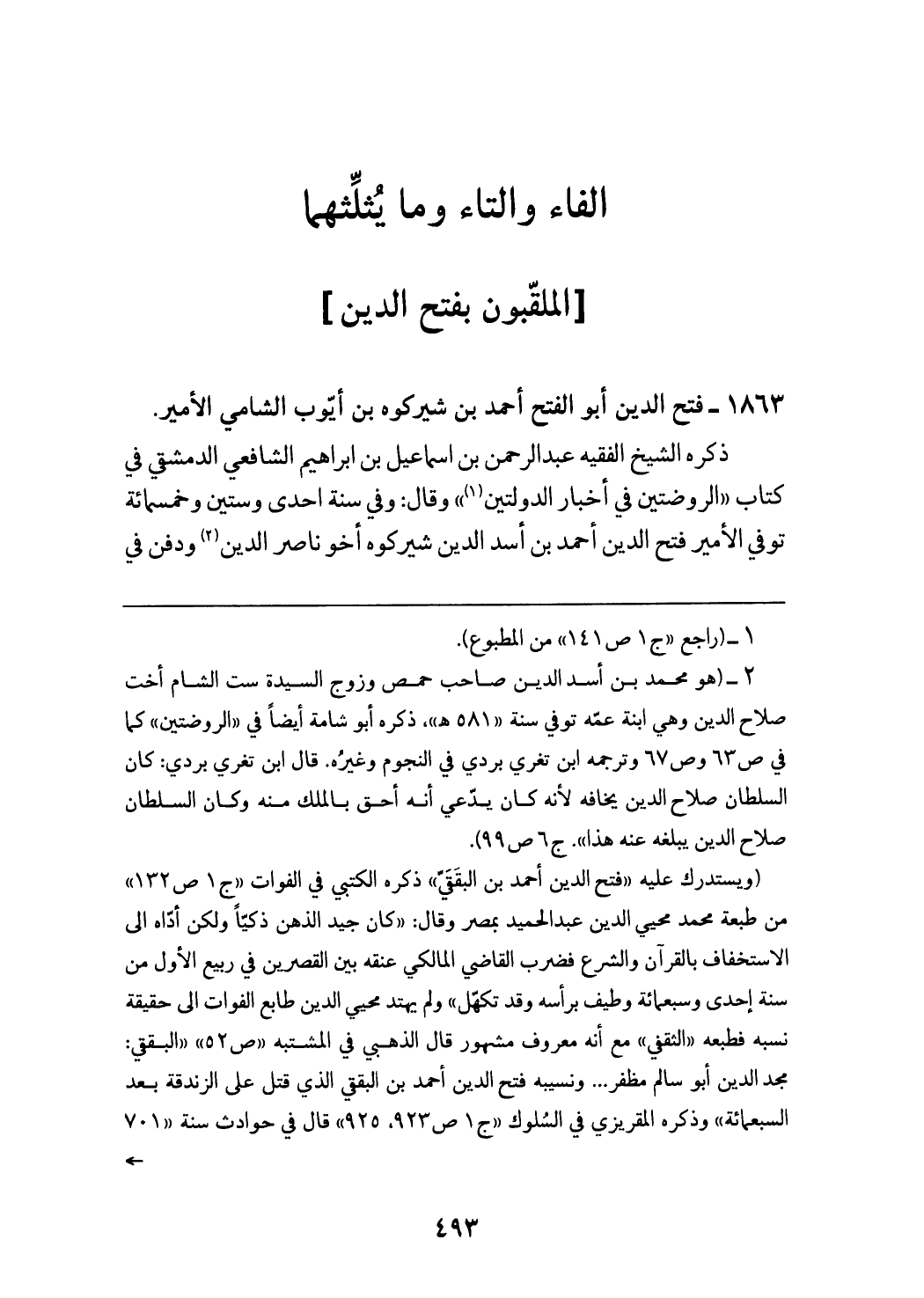 (¬2) (هو محمد بن أسد الدين صاحب حمص وزوج السيدة ست الشام أخت صلاح الدين وهي ابنة عمّه توفي سنة «581 هـ»، ذكره أبو شامة أيضا في «الروضتين» كما في ص 63 وص 67 وترجمه ابن تغري بردي في النجوم وغيره. قال ابن تغري بردي: كان السلطان صلاح الدين يخافه لأنه كان يدّعي أنه أحق بالملك منه وكان السلطان صلاح الدين يبلغه عنه هذا».ج 6 ص 99). (ويستدرك عليه «فتح الدين أحمد بن البققيّ» ذكره الكتبي في الفوات «ج 1 ص 132» من طبعة محمد محيي الدين عبد الحميد بمصر وقال: «كان جيد الذهن ذكيّا ولكن أدّاه الى الاستخفاف بالقرآن والشرع فضرب القاضي المالكي عنقه بين القصرين في ربيع الأول من سنة إحدى وسبعمائة وطيف برأسه وقد تكهّل» ولم يهتد محيي الدين طابع الفوات الى حقيقة نسبه فطبعه «الثقفي» مع أنه معروف مشهور قال الذهبي في المشتبه «ص 52» «البققي: مجد الدين أبو سالم مظفر ... ونسيبه فتح الدين أحمد بن البققي الذي قتل على الزندقة بعد السبعمائة» وذكره المقريزي في السلوك «ج 1 ص 923، 925» قال في حوادث سنة «701