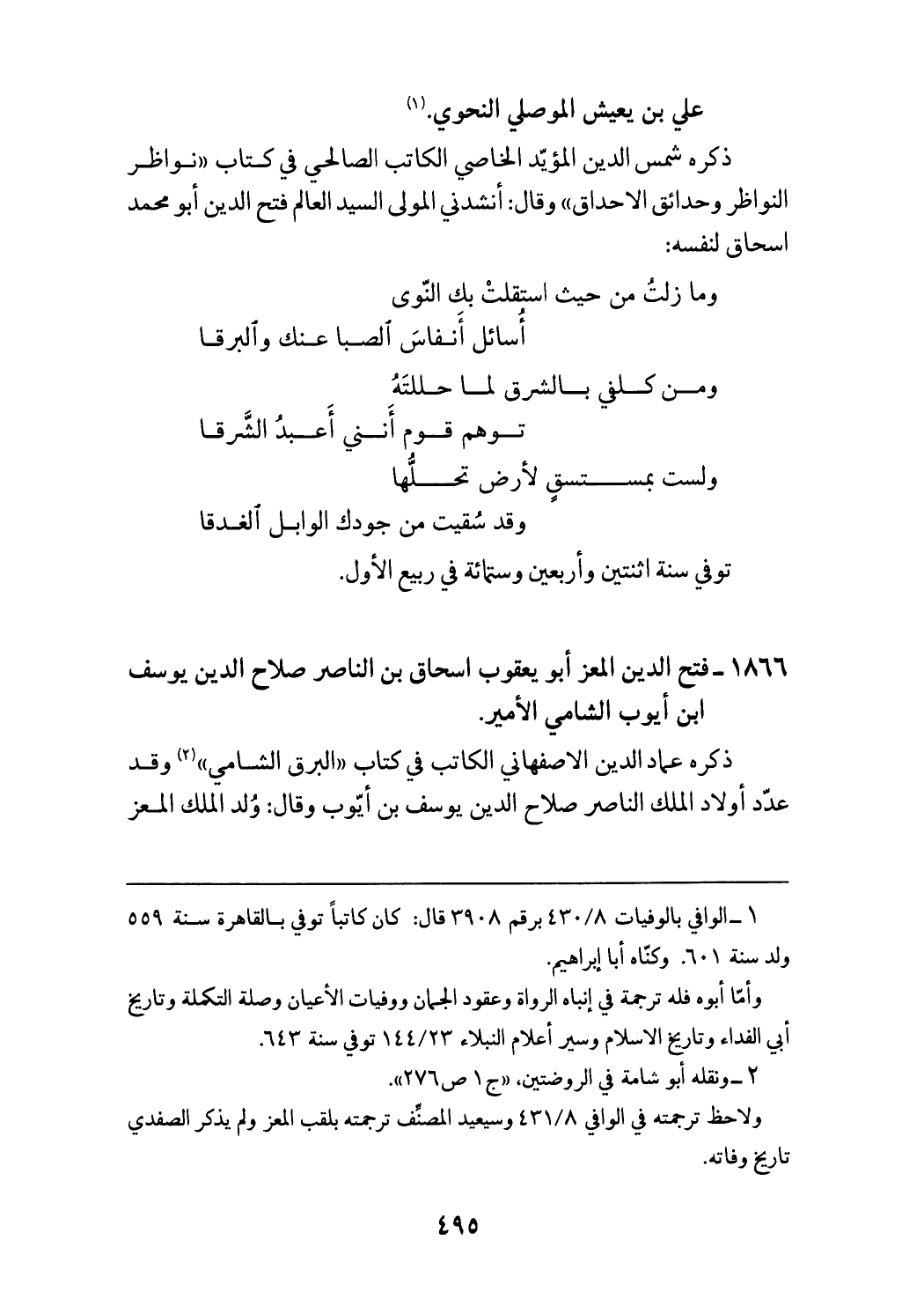 (¬2) ونقله أبو شامة في الروضتين، «ج 1 ص 276». ولاحظ ترجمته في الوافي 431/ 8 وسيعيد المصنّف ترجمته بلقب المعز ولم يذكر الصفدي تاريخ وفاته.