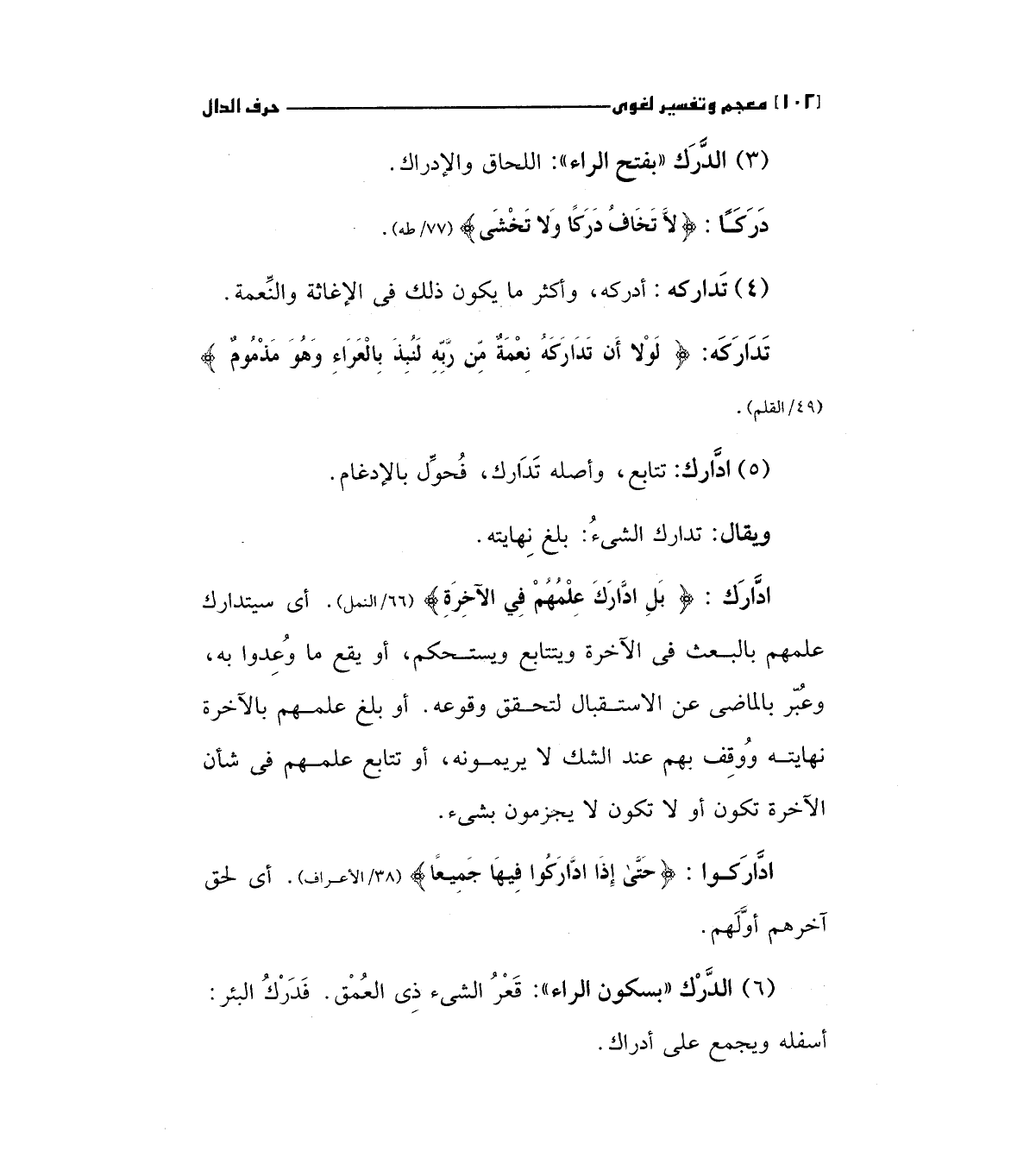 ادارك: (بَلْ ادَّارَكَ عِلْمُهُمْ فِي الآخِرَةِ) "66/النمل" أي سيتدلرك علمهم بالبعث في الآخرة ويتتابع ويستحكم، أو يقع ما وعدوا به، وعبر بالماضي عن الاستقبال لتحقق وقوعه. أمو بلغ علمهم بالآخرة نهايته ووقف بهم عند الشك لا يريمونه، أو تتابع علمهم في شأن الآخرة تكون أو لا تكون لا يجزمون بشئ.