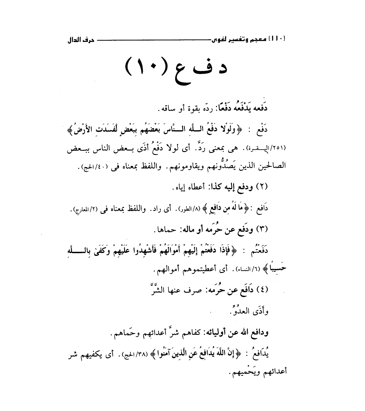 دفع: (وَلَوْلا دَفْعُ اللَّهِ النَّاسَ بَعْضَهُمْ بِبَعْضٍ لَفَسَدَتْ الأَرْضُ) "251/البقرة" هي بمعني رد. أي لولا دفع أذي بعض الناس ببعض الصالحين الذين يصدونهم ويقاومونهم واللفظ بمعناه في " 40/الحج "