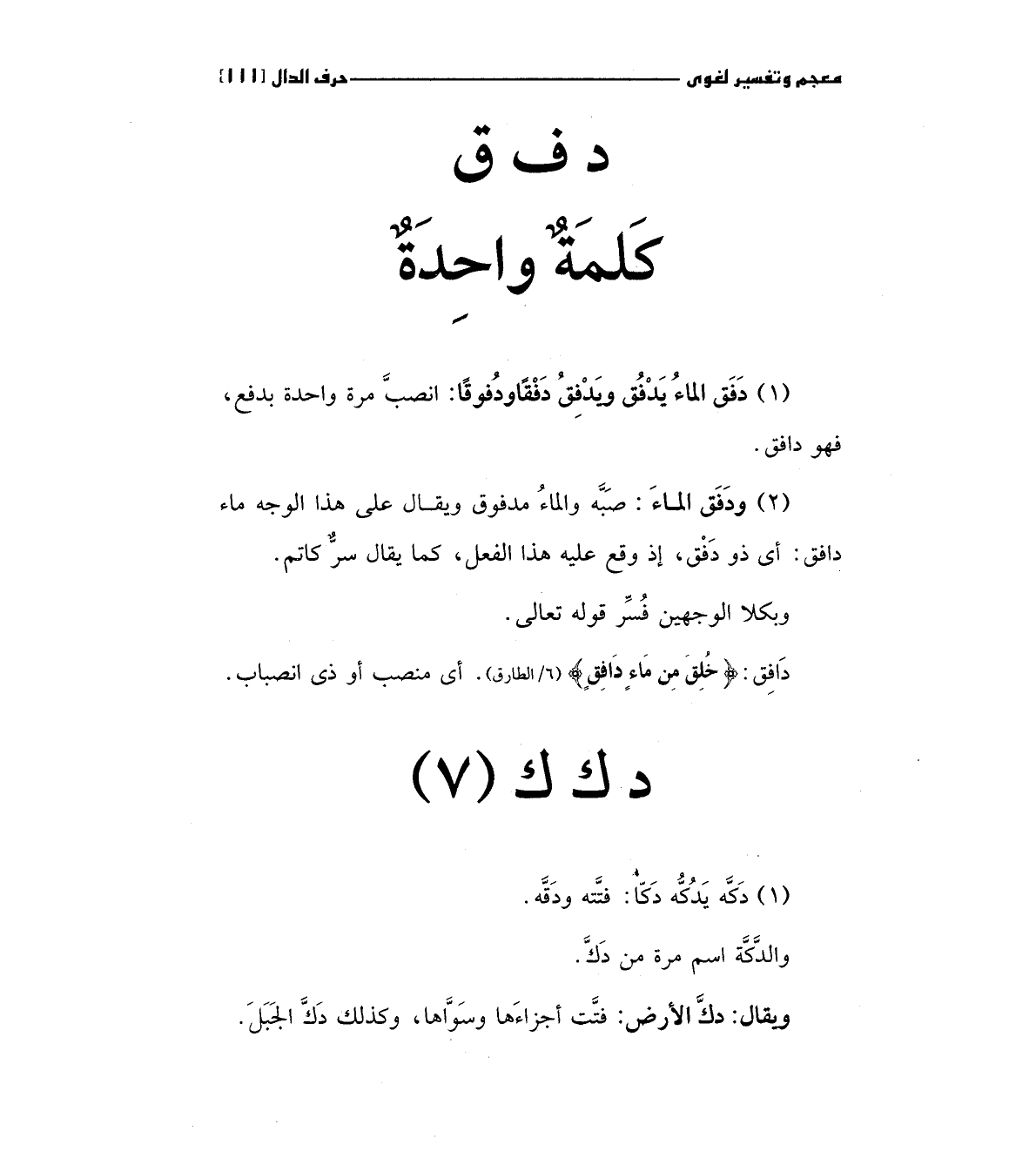 2 - ودفق الماء: صبه والماء مدفوق ويقال علي هذا الوجه ماء دافق: أي ذو دفق، وإذا وقع عليه هذا الفعل، كما يقال سر كاتم.