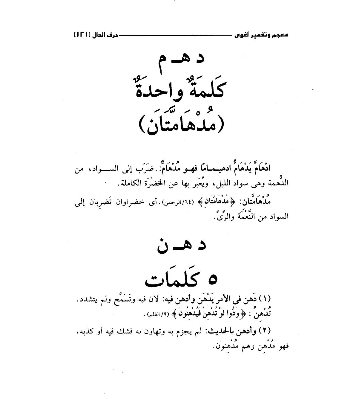 مدهامتان: (مُدْهَامَّتَانِ) "64/الرحمن "أي خضراوان تضربان إلي السواد من النعمة والري.