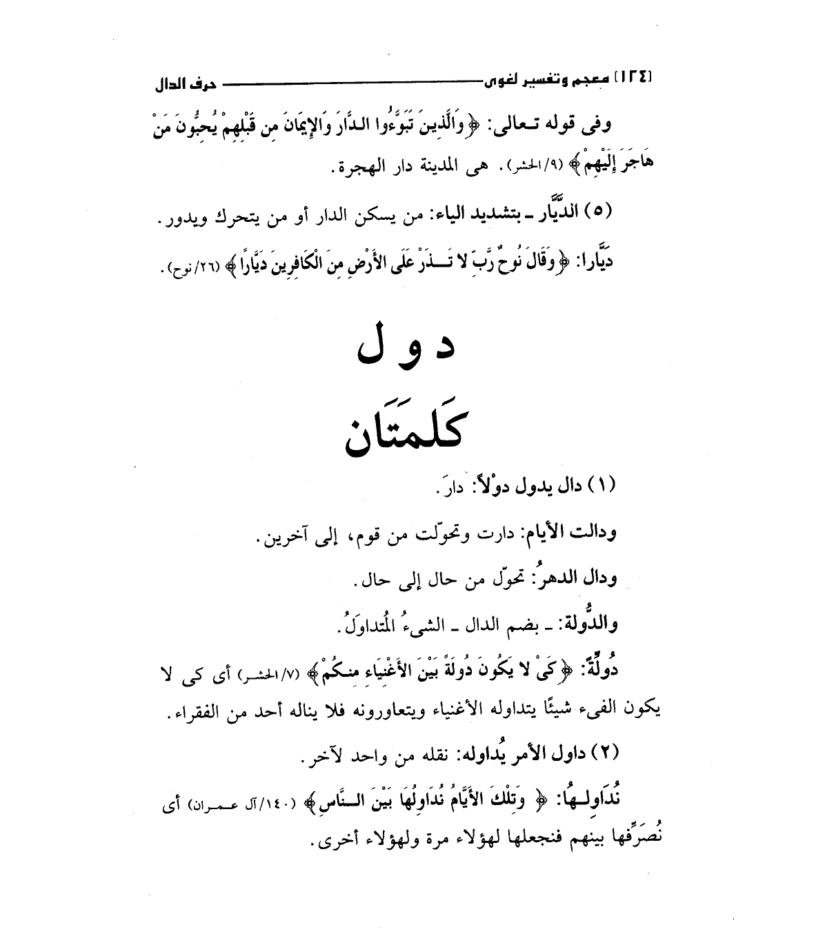 دولة: (كَيْ لا يَكُونَ دُولَةً بَيْنَ الأَغْنِيَاءِ مِنْكُمْ) "7/الحشر" أي كي لا يكون الفئ شيئا يتداوله الأغنياء ويتعاورونه فلا يناله أحد من الفقراء.
